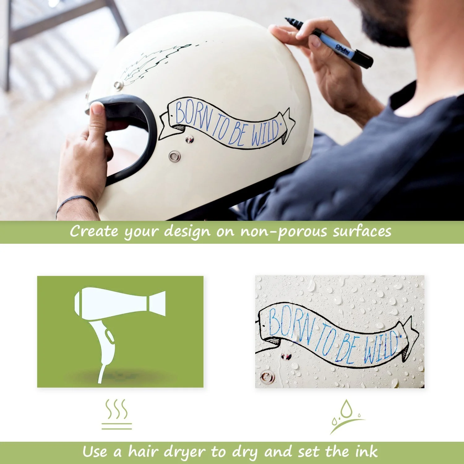 Se recomienda hornear en horno de casa para fijar el color. Aplicar calor a los objetos como cascos, patinetas etc, para fijar el color.