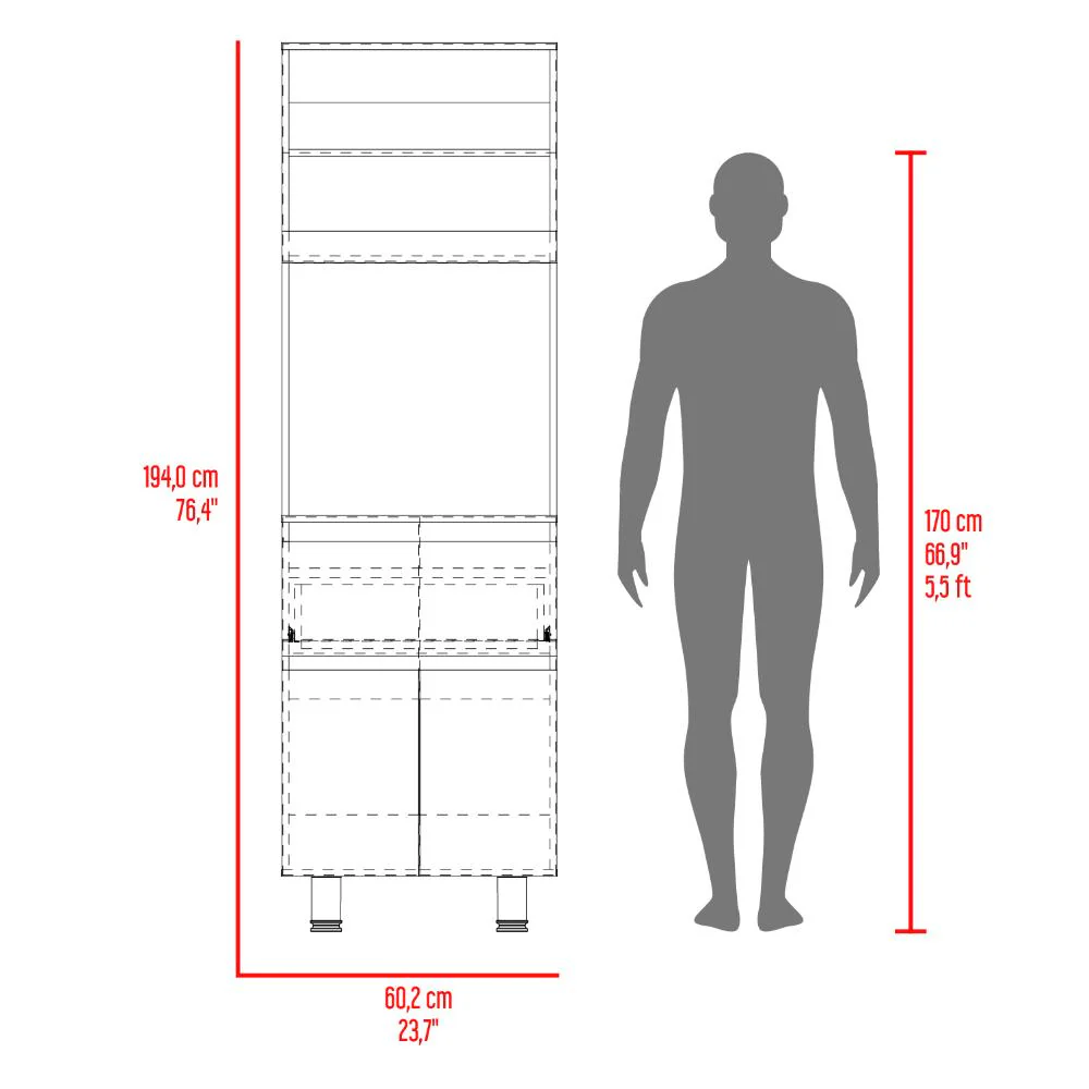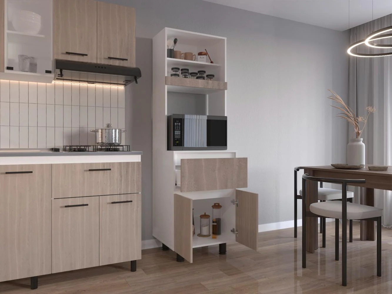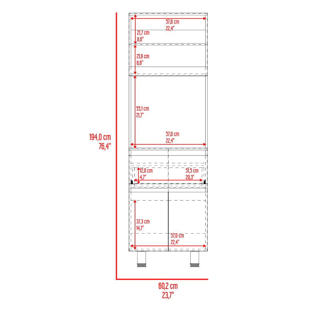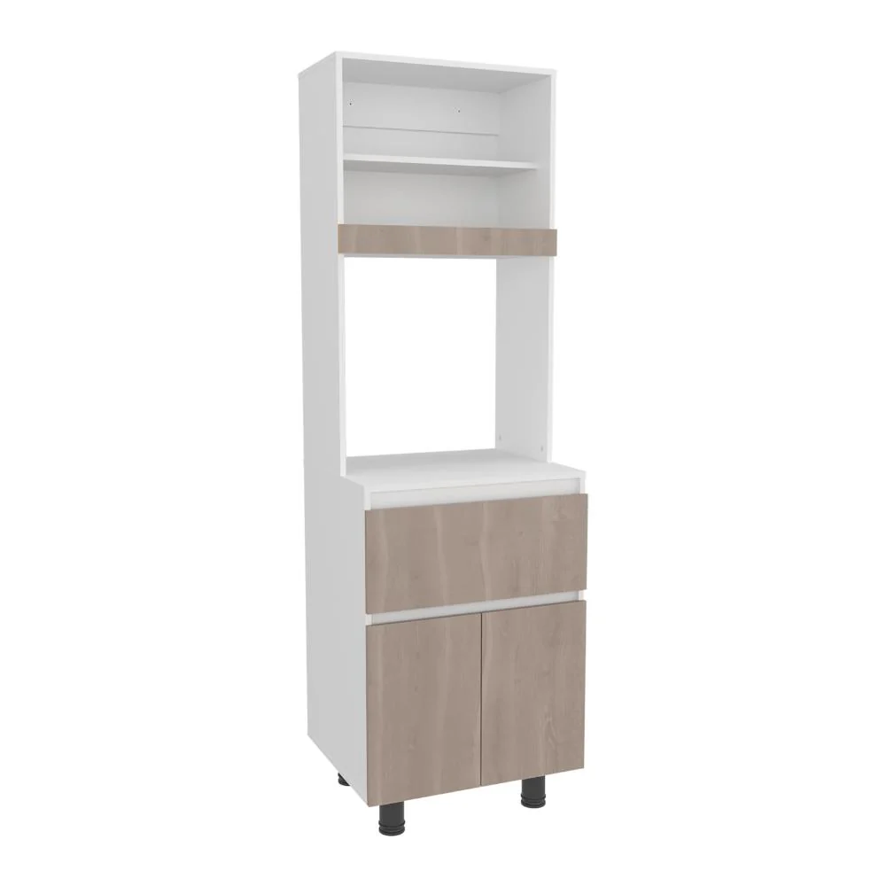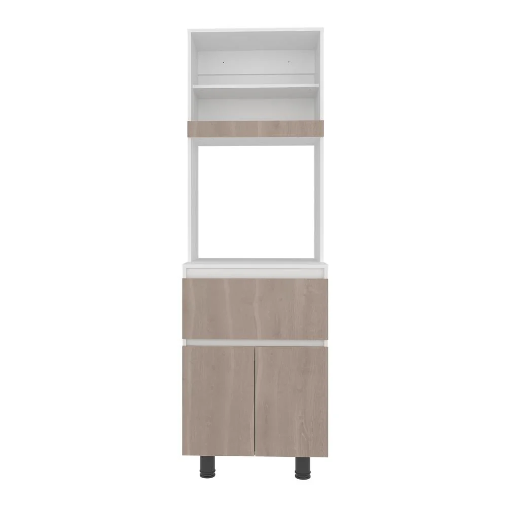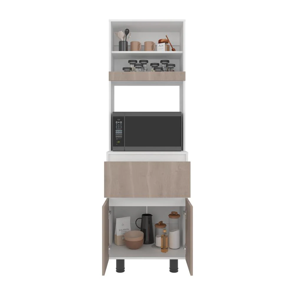 Alacena, con dos puertas abatibles, amplios espacios para almacenamiento, espacio para microondas, patas en acero, un cajón