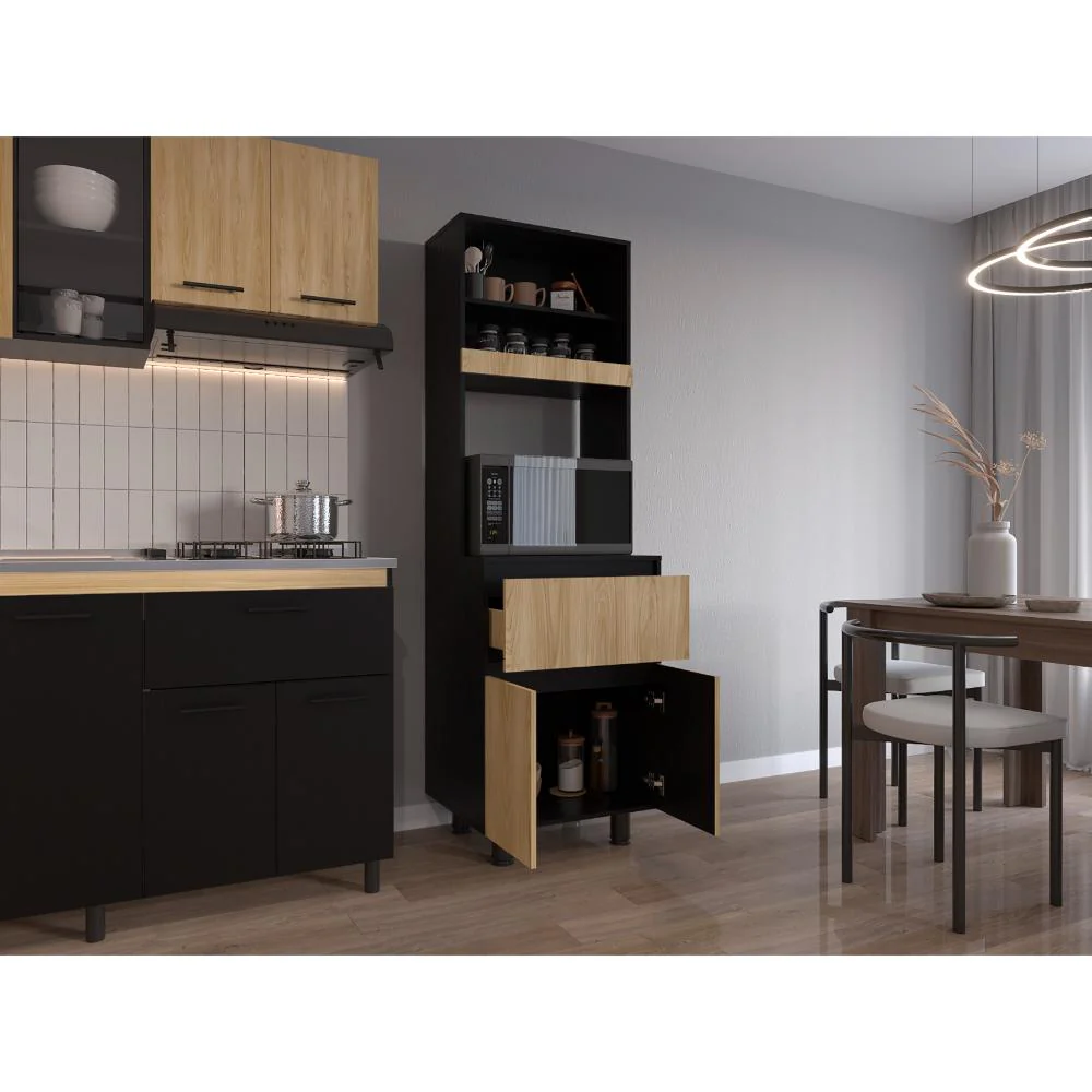 Alacena, con dos puertas abatibles, amplios espacios para almacenamiento, espacio para microondas, patas en acero, un cajón