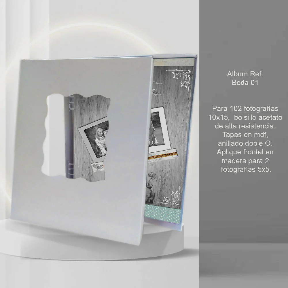 Album en madera para 102 fotografias tamaño postal, mdf en corte y grabado laser- Full Color (24X32 cm) fotografía 10X15cm, 3 hojas iniciales de presentación ..bolsillo en acetato calibre 40, hoja individual para 6 fotografias, sistema de argollado metalico empaque individual en caja x unidad. Color Gris