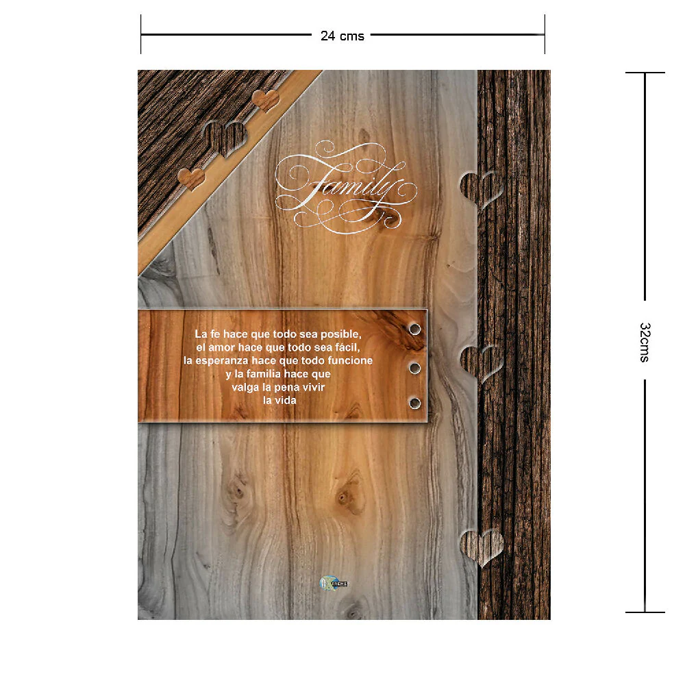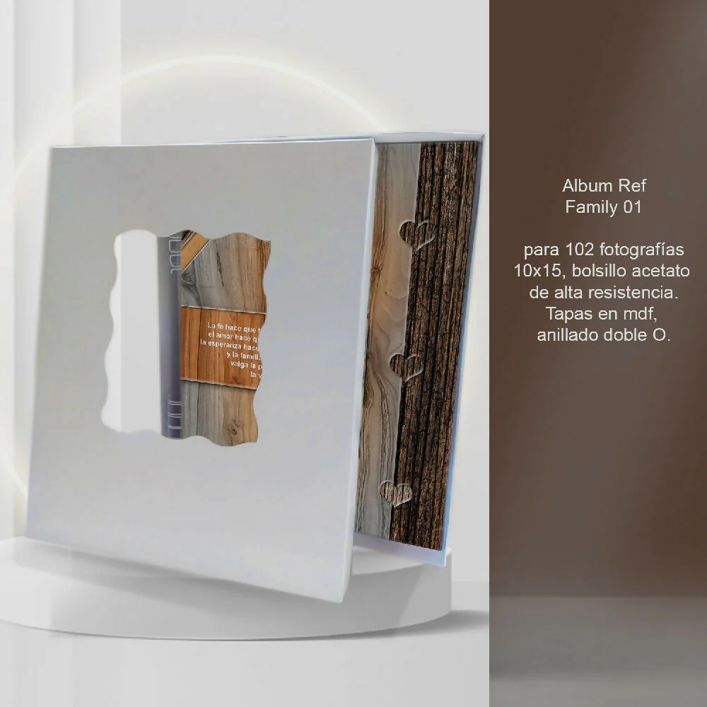Álbum en madera para 102 fotografias tamaño postal, mdf en corte y grabado laser- Full Color (24X32 cm) fotografía 10X15cm, 3 hojas iniciales de presentación ..bolsillo en acetato calibre 40, hoja individual para 6 fotografias, sistema de argollado metalico empaque individual en caja x unidad. Color Madera y Gris