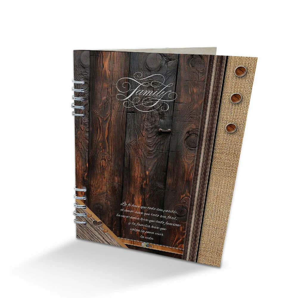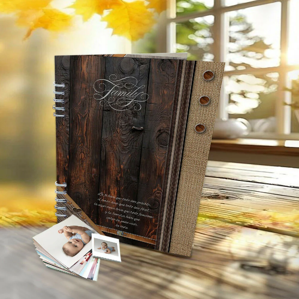 Álbum en madera para 102 fotografias tamaño postal, mdf en corte y grabado laser- Full Color (24X32 cm) fotografía 10X15cm, 3 hojas iniciales de presentación ..bolsillo en acetato calibre 40, hoja individual para 6 fotografias, sistema de argollado metalico empaque individual en caja x unidad. Color Madera y Crema