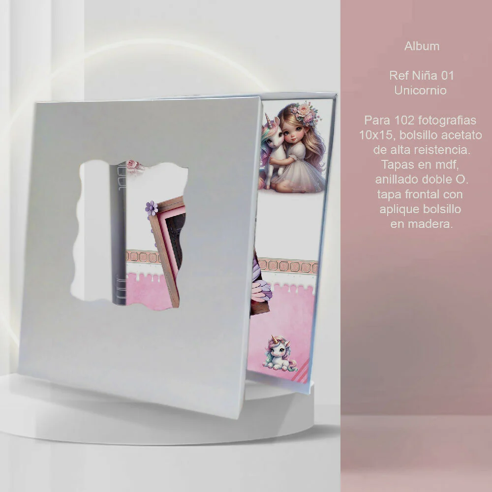 Álbum en madera para 102 fotografias tamaño postal, mdf en corte y grabado laser- Full Color (24X32 cm) fotografía 10X15cm, 3 hojas iniciales de presentación ..bolsillo en acetato calibre 40, hoja individual para 6 fotografias, sistema de argollado metalico empaque individual en caja x unidad. Color Blanco y Rosado
