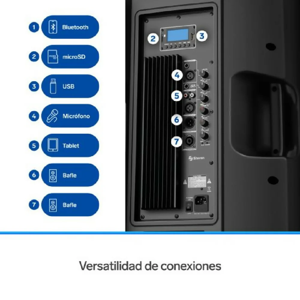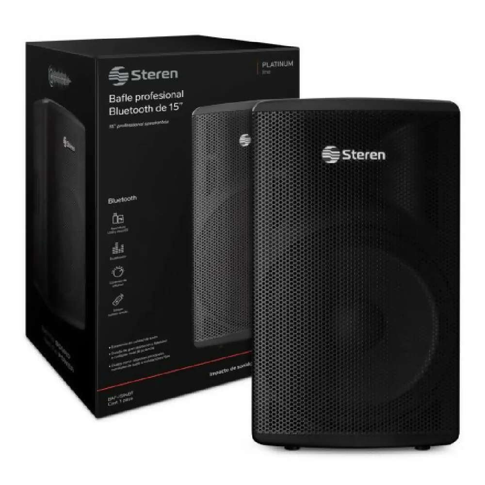 Parlante Profesional Bluetooth de 15″, potencia de 12,000 W PMPO con sistema de 2 vías para eventos de gran escala. Elaborado en Plástico rígido, diseñado para acústica óptima y durabilidad.