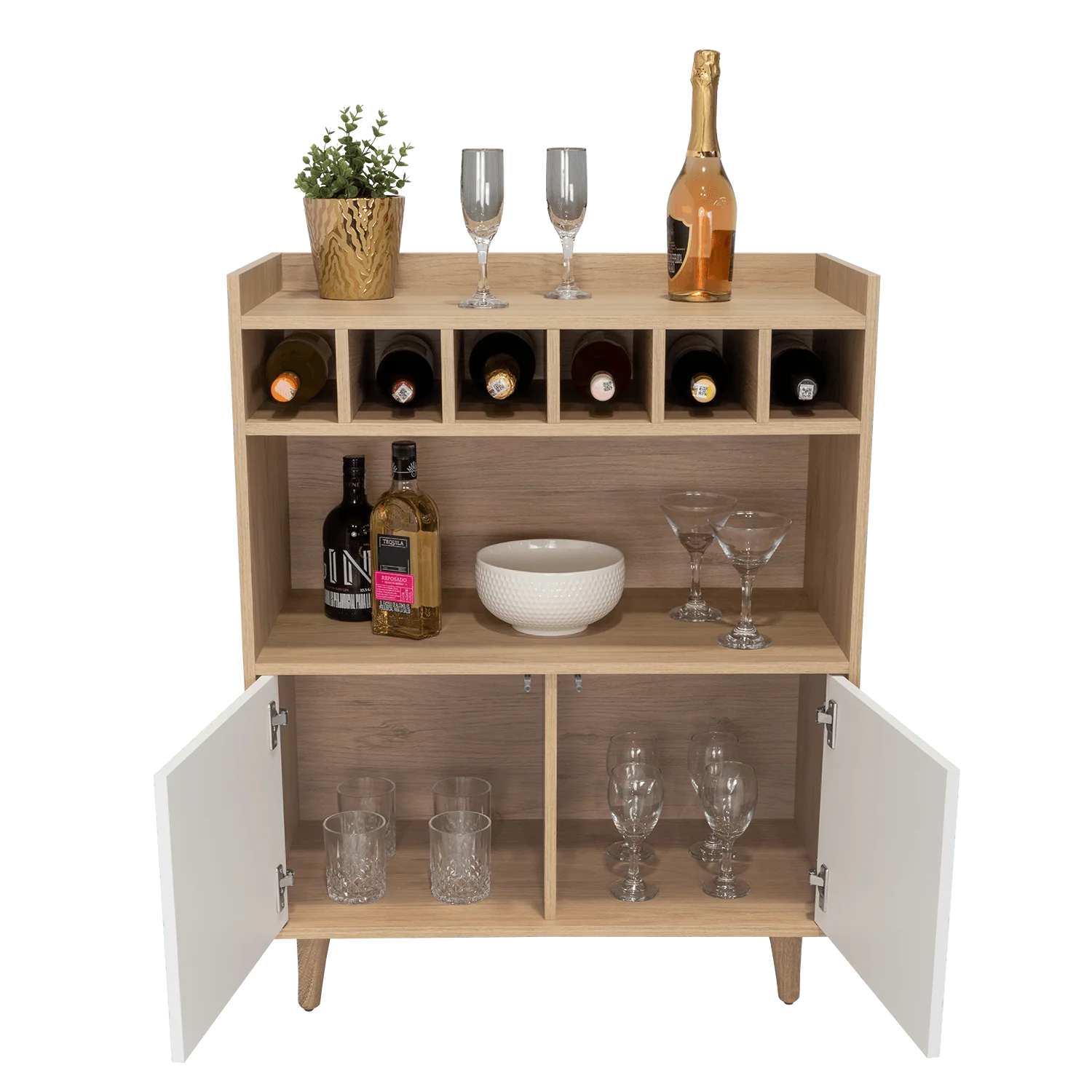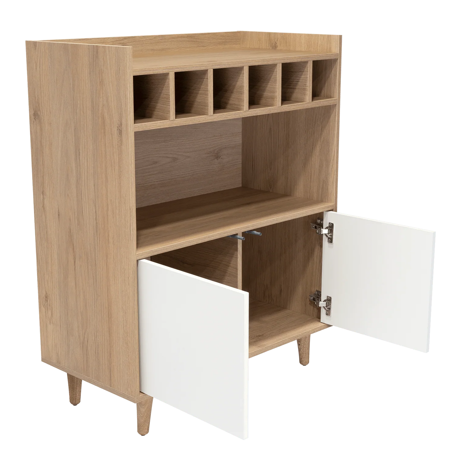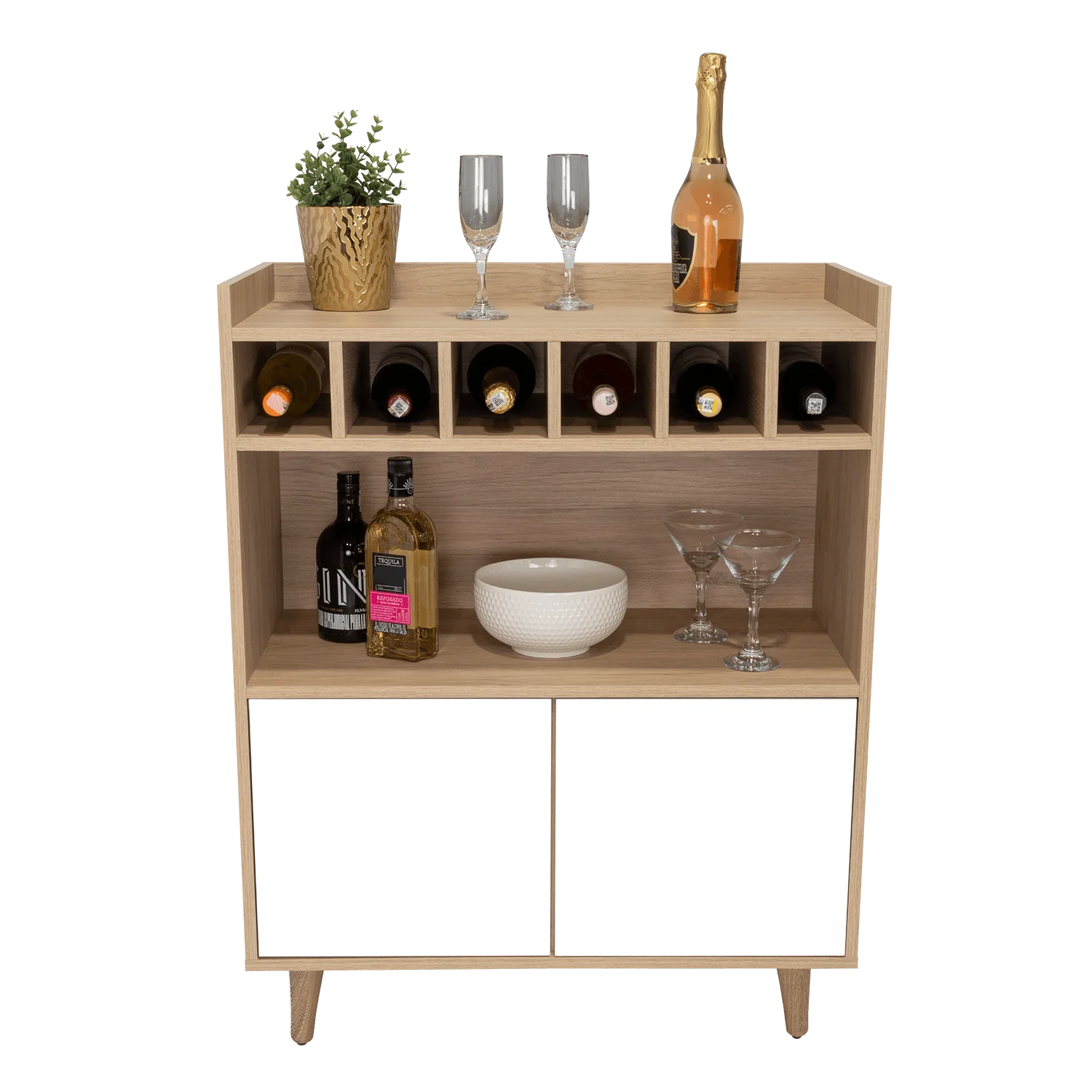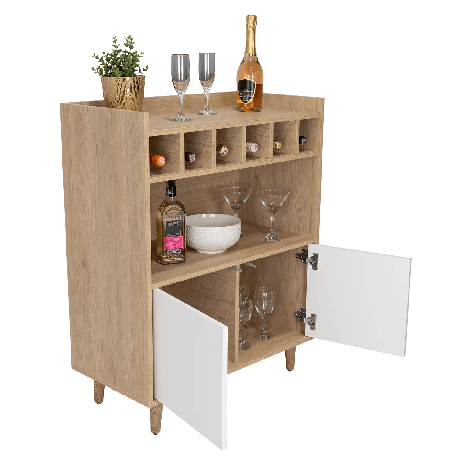 Bar, con espacio para Botella de vino y copas, diseño moderno con combinación de colores, y 2 puertas batientes.