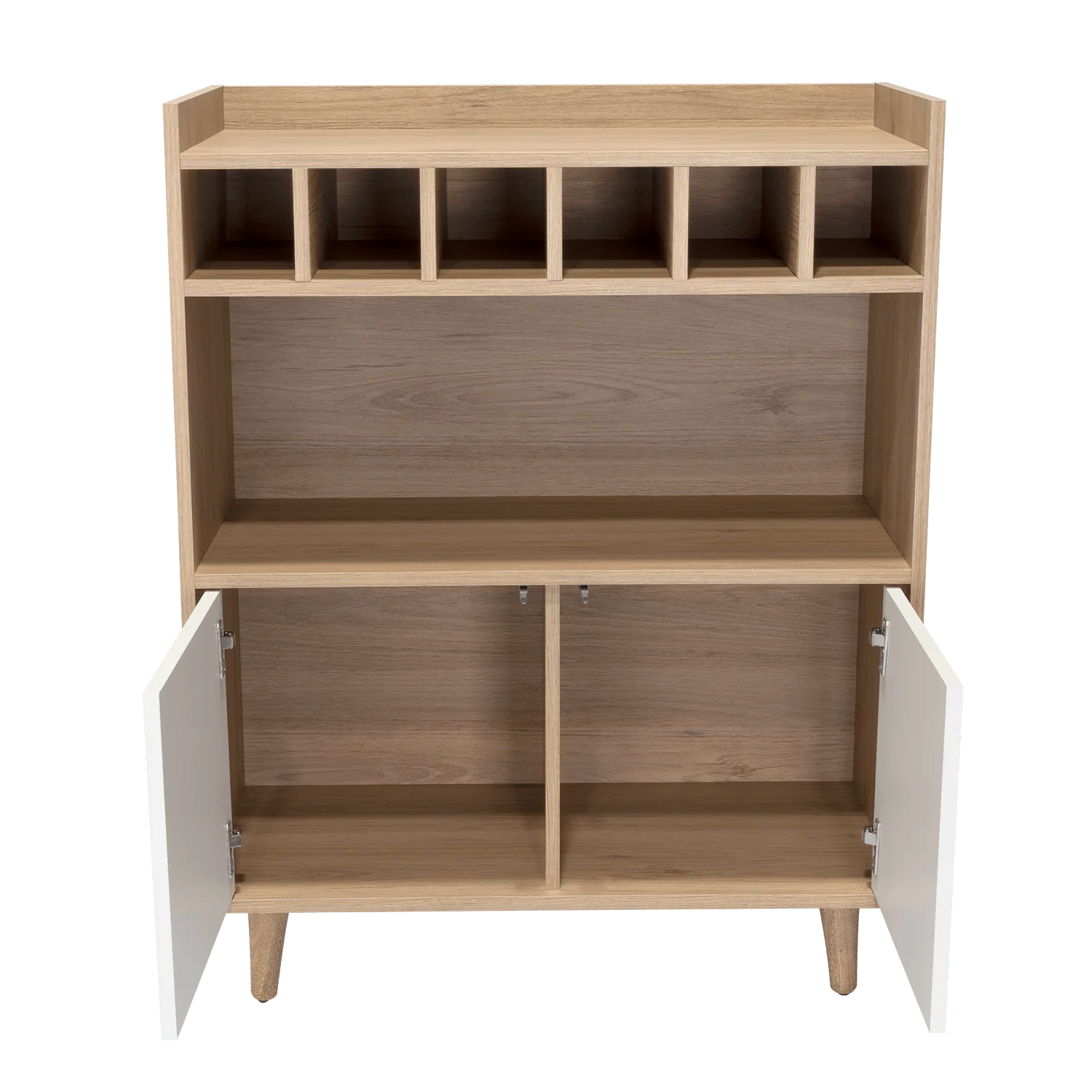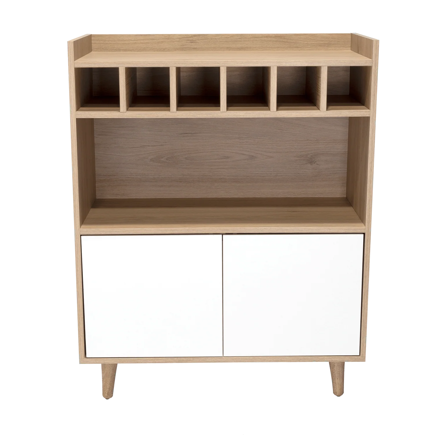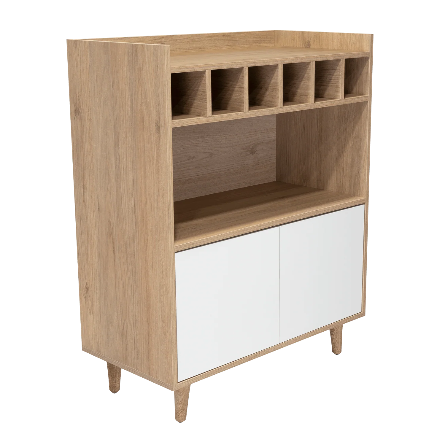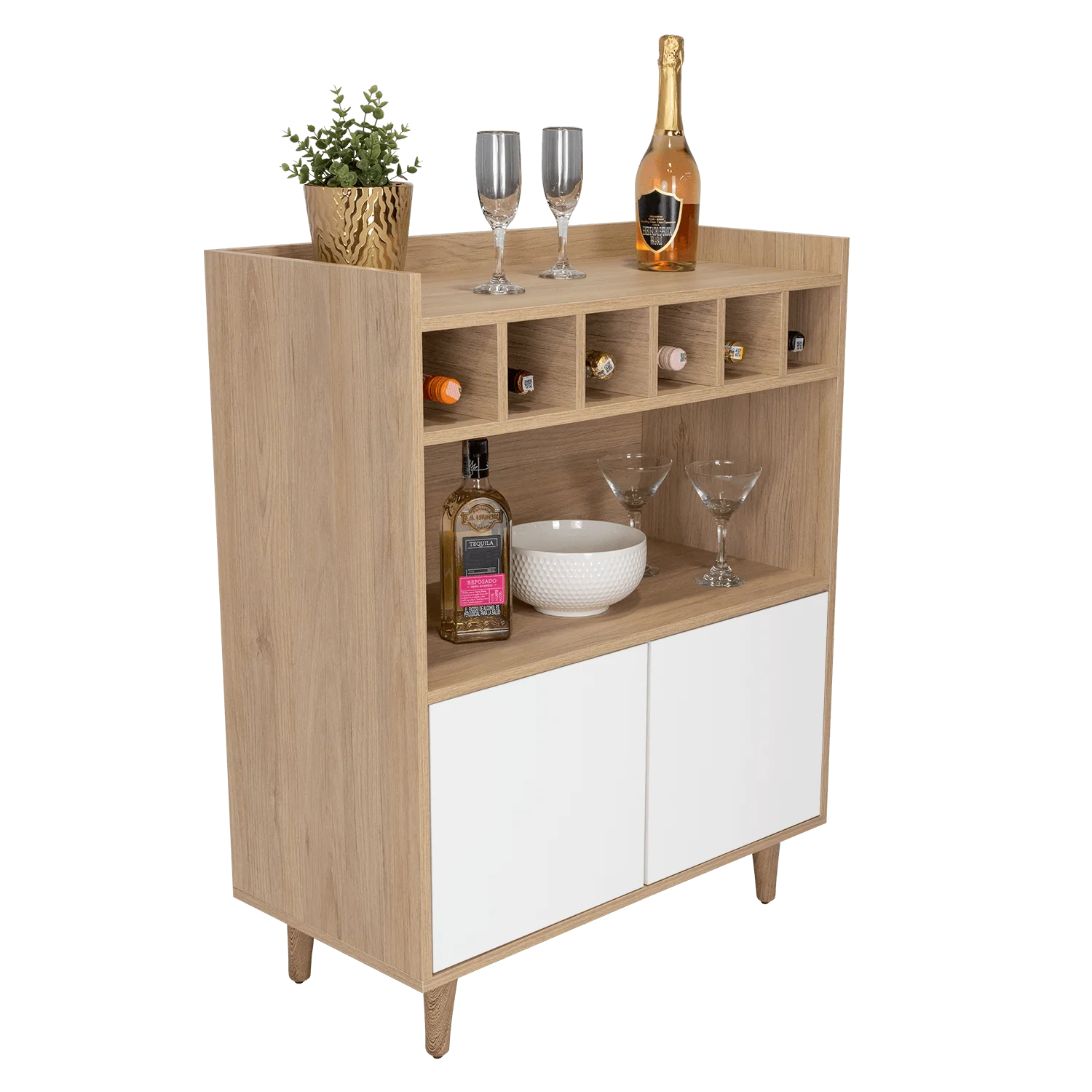 Bar, con espacio para Botella de vino y copas, diseño moderno con combinación de colores, y 2 puertas batientes.