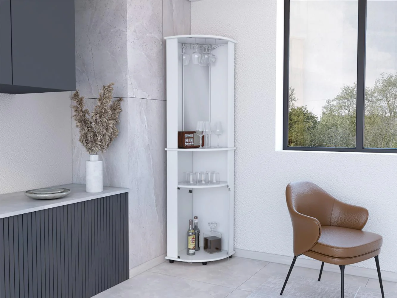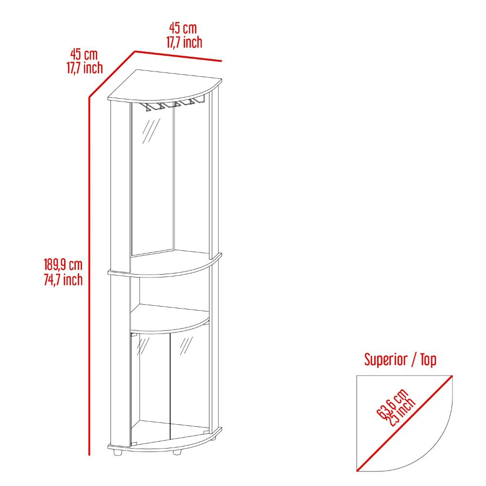 Bar, con colgador de copas, dos puertas de vidrio, espejo, espacio para almacenar botellas y objetos del bar.