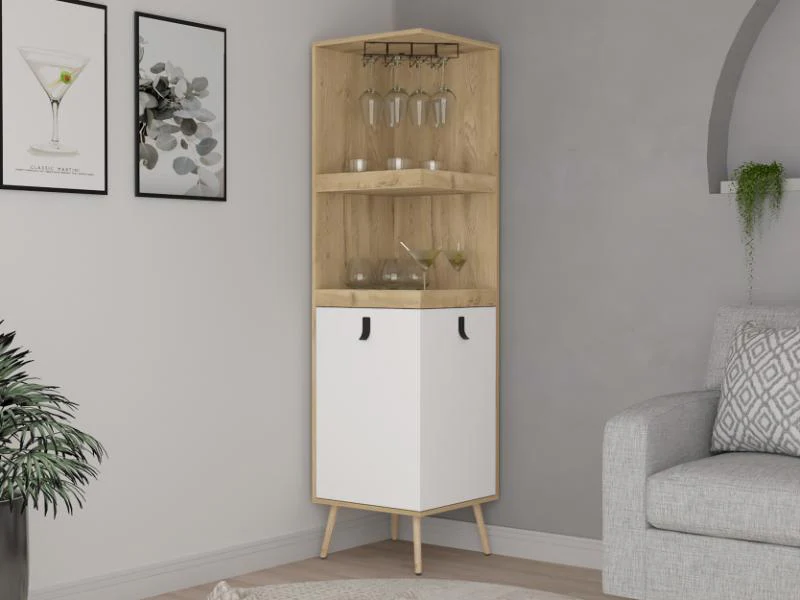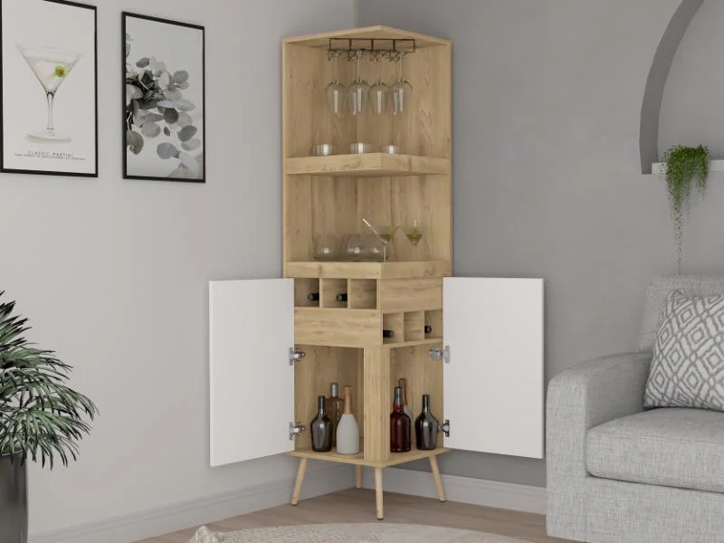 Bar Esquinero, con espacio superior para copas de vino, espacio para organizar licores, patas metálicas con acabado madero