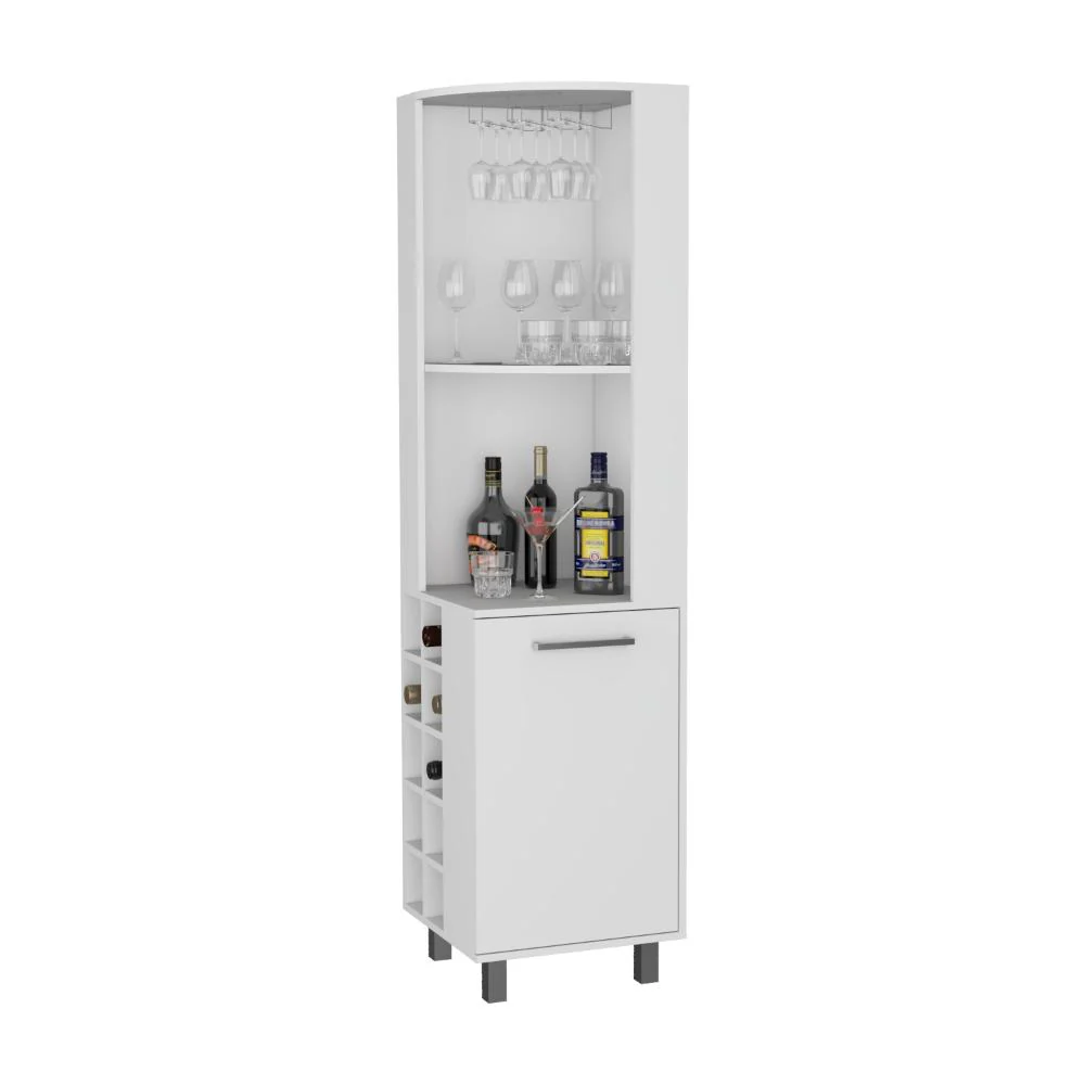 Bar Esquinero, con espacio superior para almacenar copas de vino, espacio para organizar licores, patas metálicas en acero negro