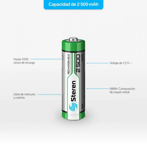 La Batería NiMH 1,2 V Recargable Steren es una excelente opción para dispositivos que requieren alta capacidad de energía. Con una capacidad nominal de 2500 mAh, estas baterías ofrecen una duración prolongada y son ideales para usar en juguetes, controles remoto, equipos de cómputo como teclados y mouses, entre otros. Compuestas de níquel-metal (NiMH), son una opción más ecológica ya que no contienen metales pesados1. Además, su diseño resistente garantiza una larga vida útil y un rendimiento confiable.