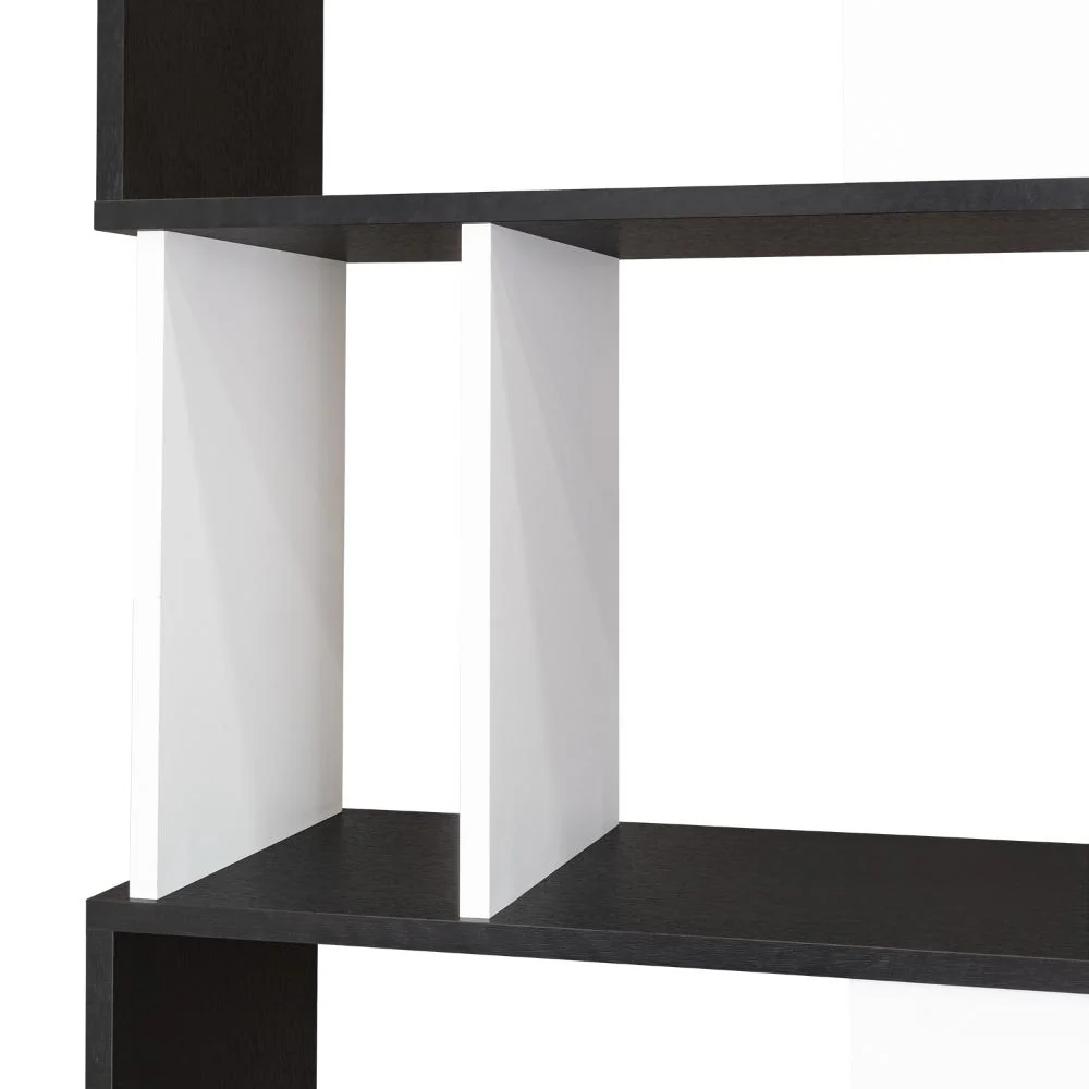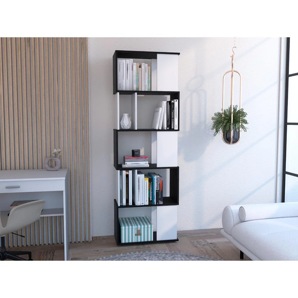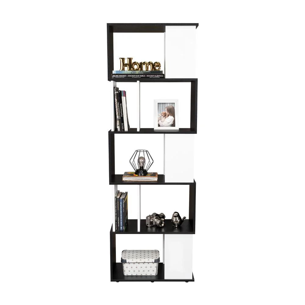 Biblioteca, con diseño minimalista, compartimientos para objetos de estudio o decorativos, múltiples entrepaños y superficies para ubicar objetos.