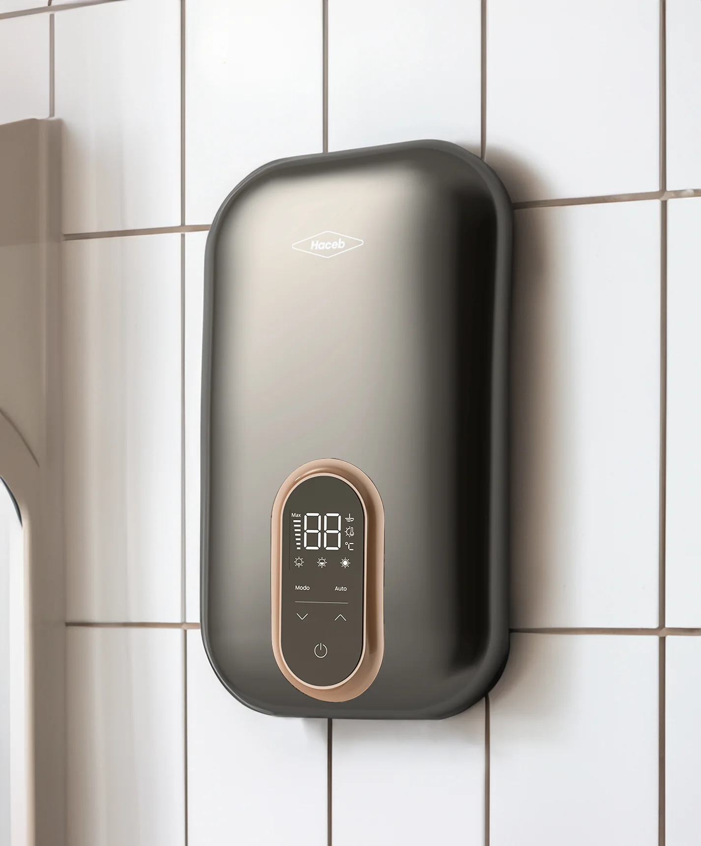 Calentador eléctrico, Panel de control táctil e intuitivo, 7 litros de capacidad, funcionamiento silencioso, control de sobrepresión de agua, sistemas de seguridad, temperatura automática, calentamiento instantáneo, control de temperatura digital, diseño compacto ultra-delgado en colo Gris y material plástico.