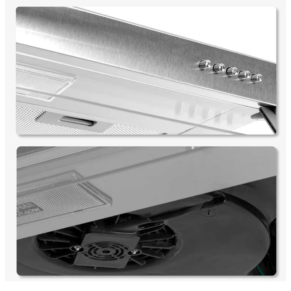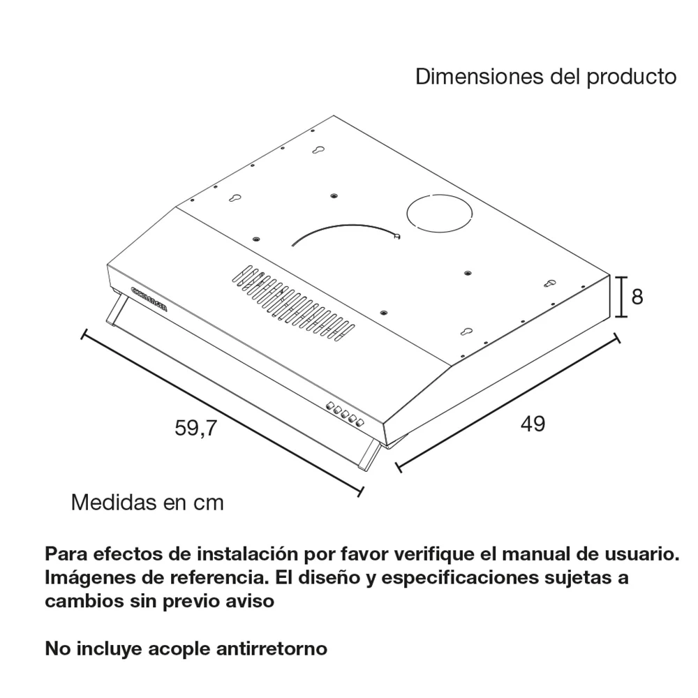 Con un tamaño de 60 cm de ancho y una profundidad de 48.3 cm, este modelo es perfecto para cocinas de tamaño medio. Su potencia de 100 W y sus tres velocidades permiten un control eficiente de la ventilación, adaptándose a tus necesidades de cocción. Además, cuenta con controles frontales tipo rocket switch que facilitan su uso.