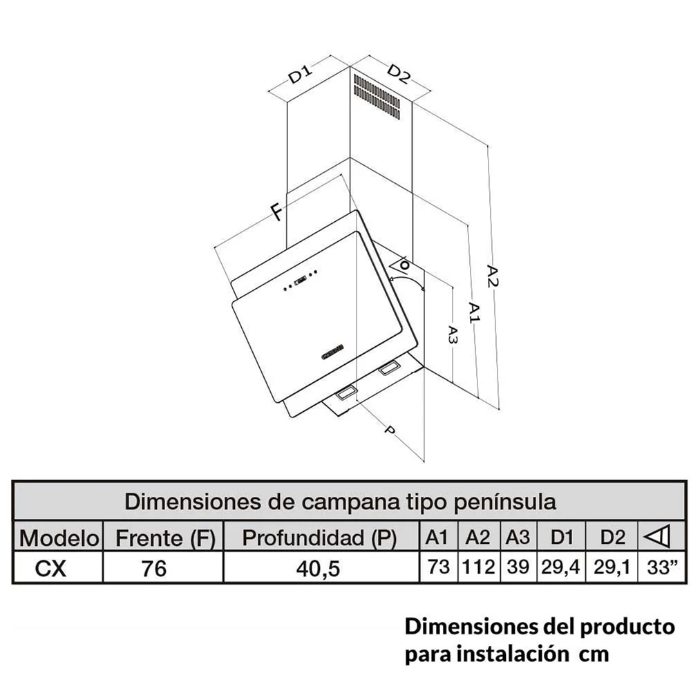 Este modelo cuenta con un control de botón que permite seleccionar entre tres velocidades, adaptándose a sus necesidades de cocción. Además, incluye dos filtros que aseguran una eficaz purificación del aire. La campana está diseñada para ser instalada de pared, con un cubretubo que varía entre 34 cm y 73 cm de altura, lo que facilita su integración en diferentes configuraciones de cocina.