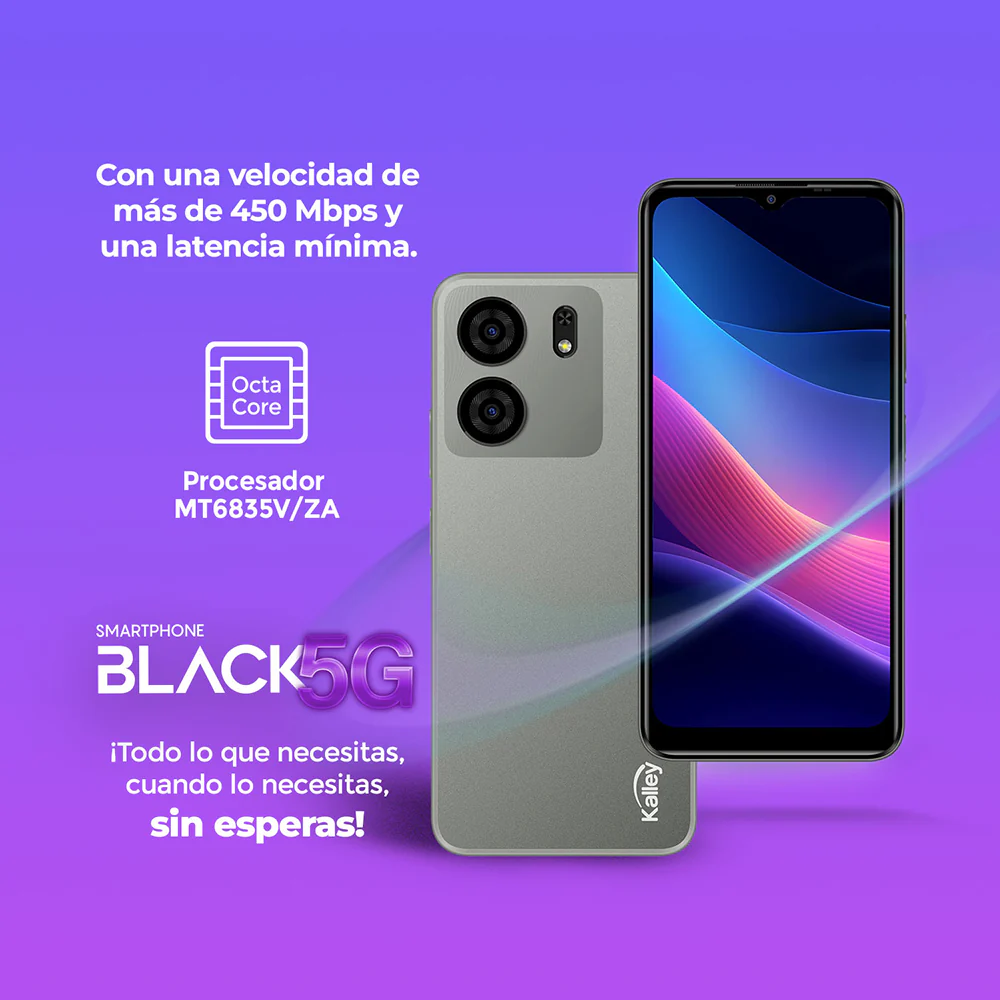 ¡Descubre el celular KALLEY Black 5, dispositivo 5G desarrollado por una marca colombiana! Ahora puedes disfrutar de una velocidad ultra rápida, con baja latencia y mayor capacidad de red para que estés siempre conectado y sin perderte de nada. Además podrás acceder a nuevas aplicaciones y servicios, estando a la vanguardia de la tecnología. ¡Lleva el tuyo ahora y no te pierdas esta súper experiencia disponible para ti!