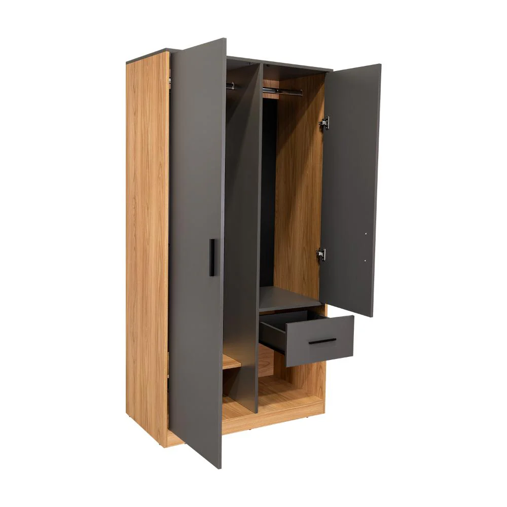 Closet, con amplia superficie y abierta para colorar ropa e implementos personales, dos puertas abatibles, un cajón, diseño moderno.