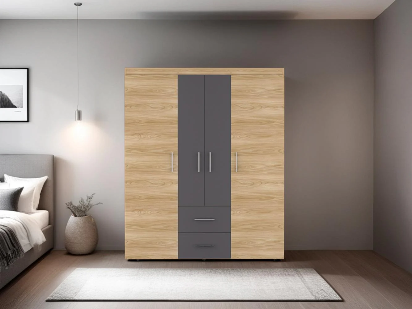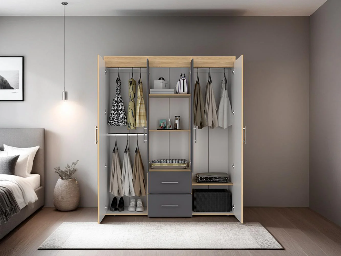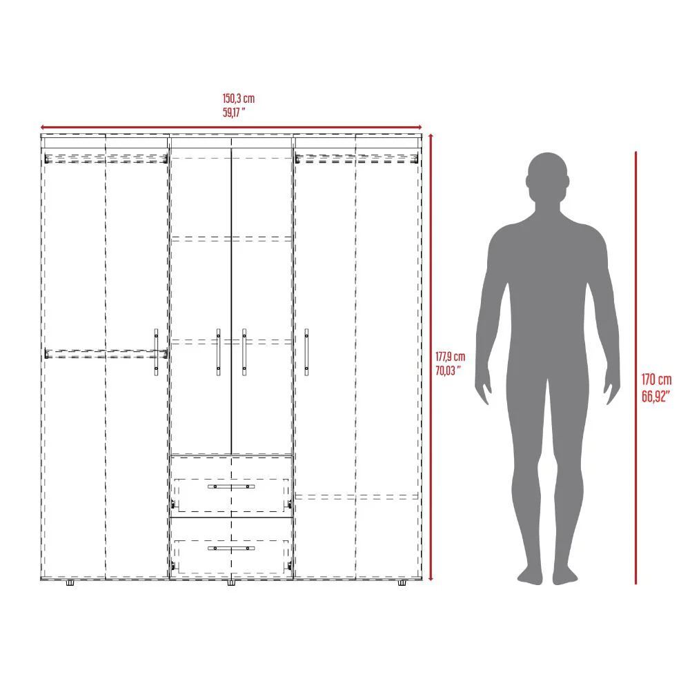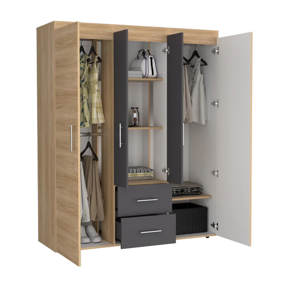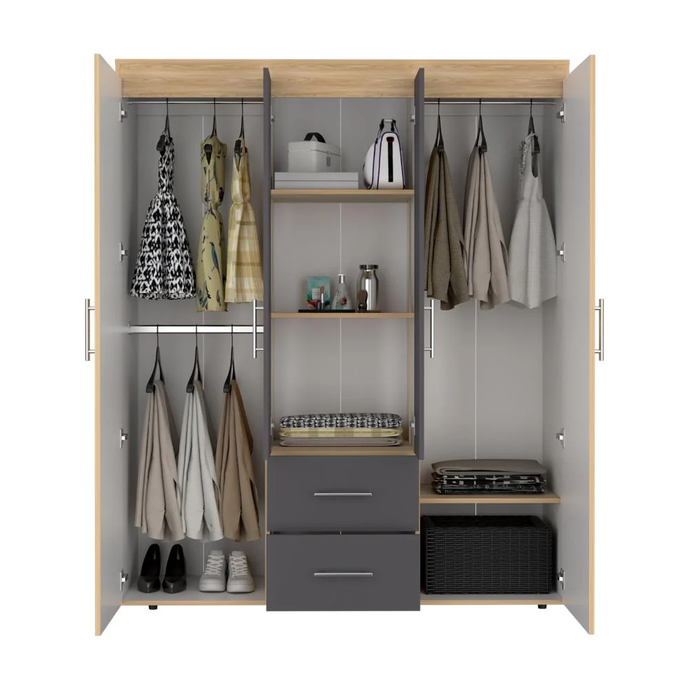 Closet, con cuatro puertas batientes, dos cajones, tres tubos pata colgar ropa y amplios espacios de guardado. Con manijas doradas.
