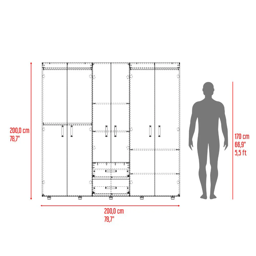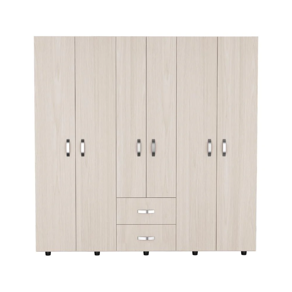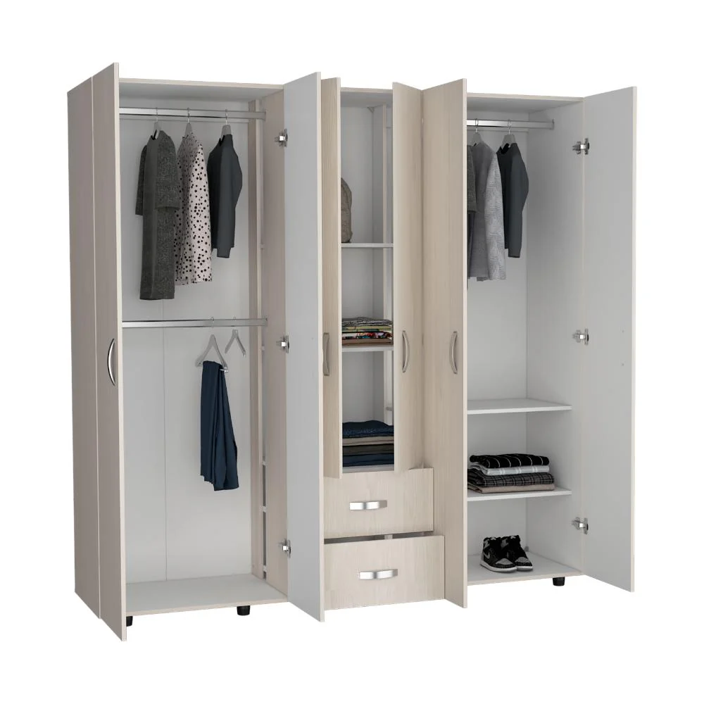 Closet, con cuatro puertas abatibles, dos cajones, tres tubos de acero cromado para colgar ropa, amplios espacios para guardar ropa.