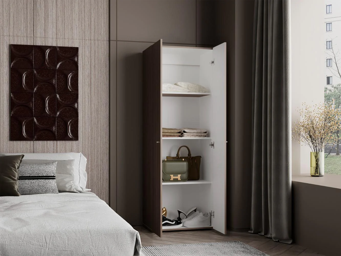 Closet, con 2 puertas abatibles, 4 entrepaños, con espacio para almacenar ropa y objetos, 3 botones en aluminio y es de facil instalación.