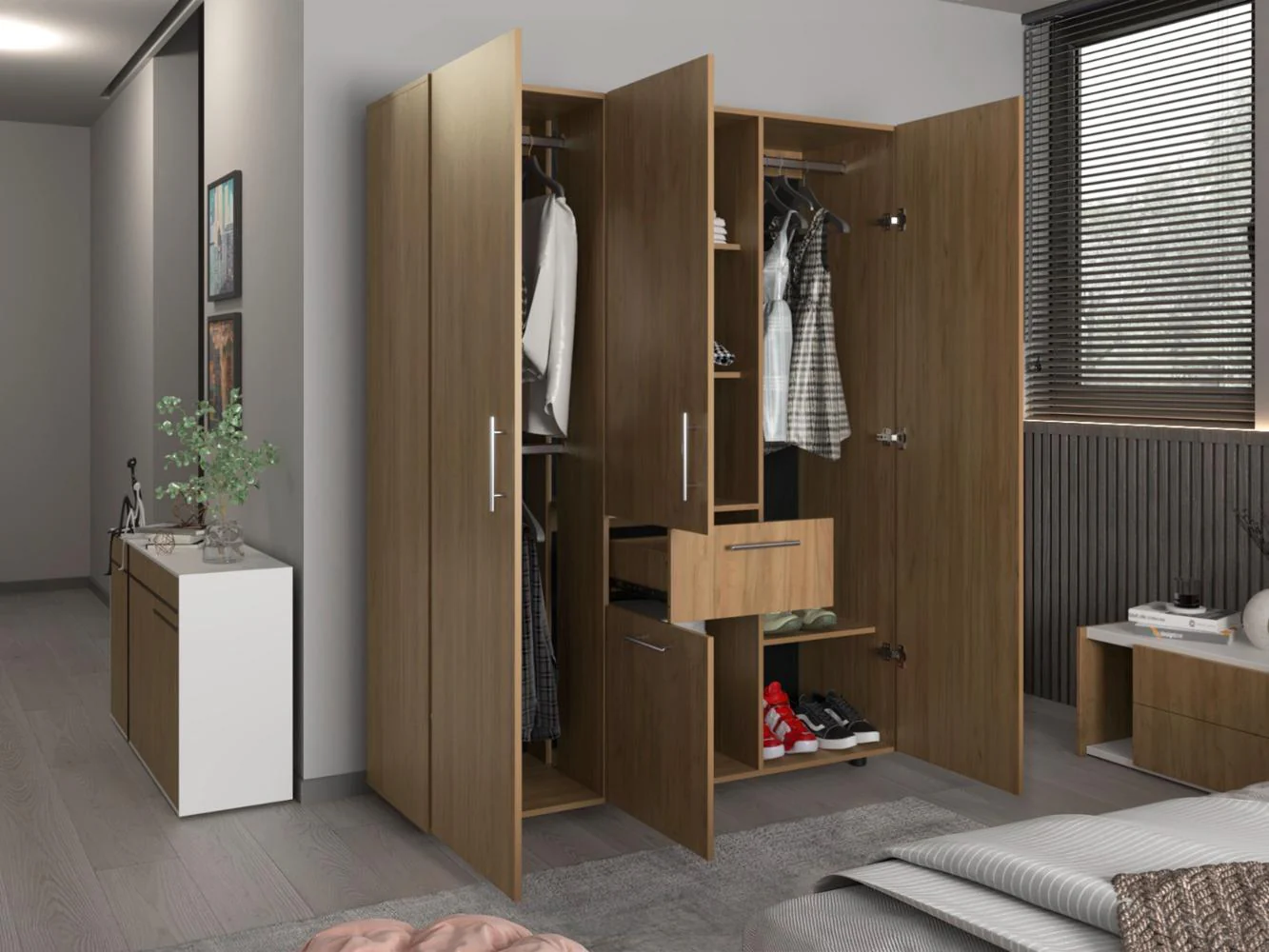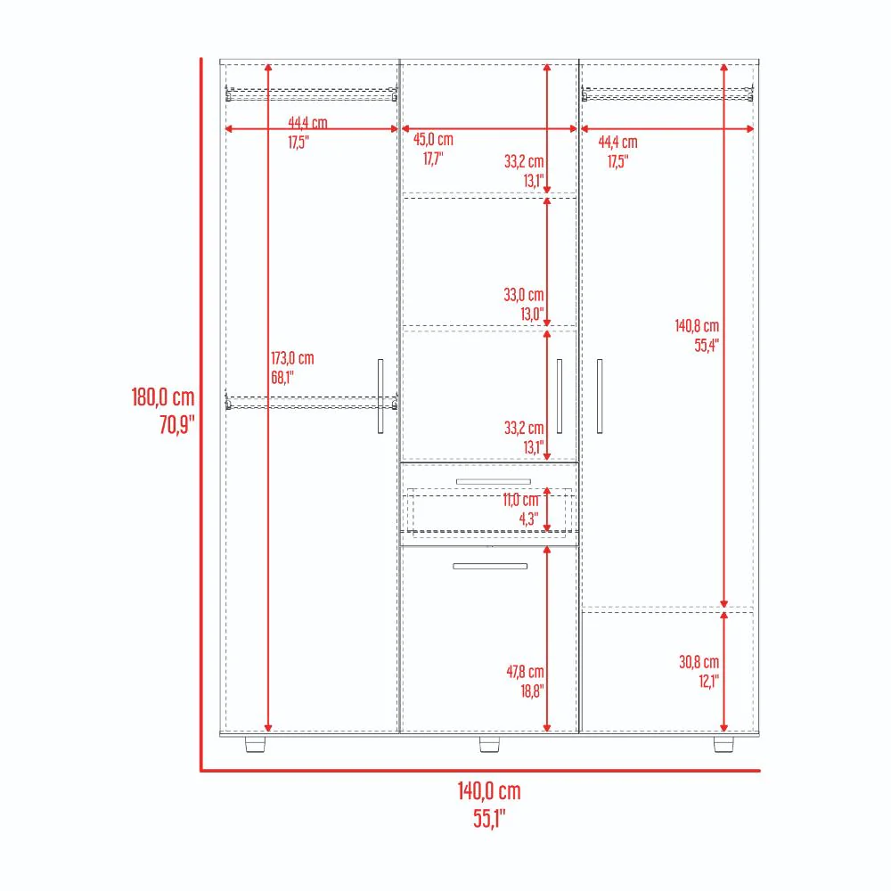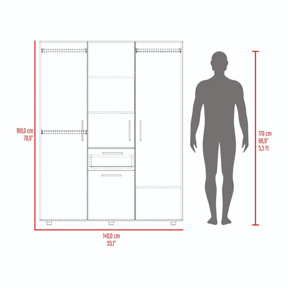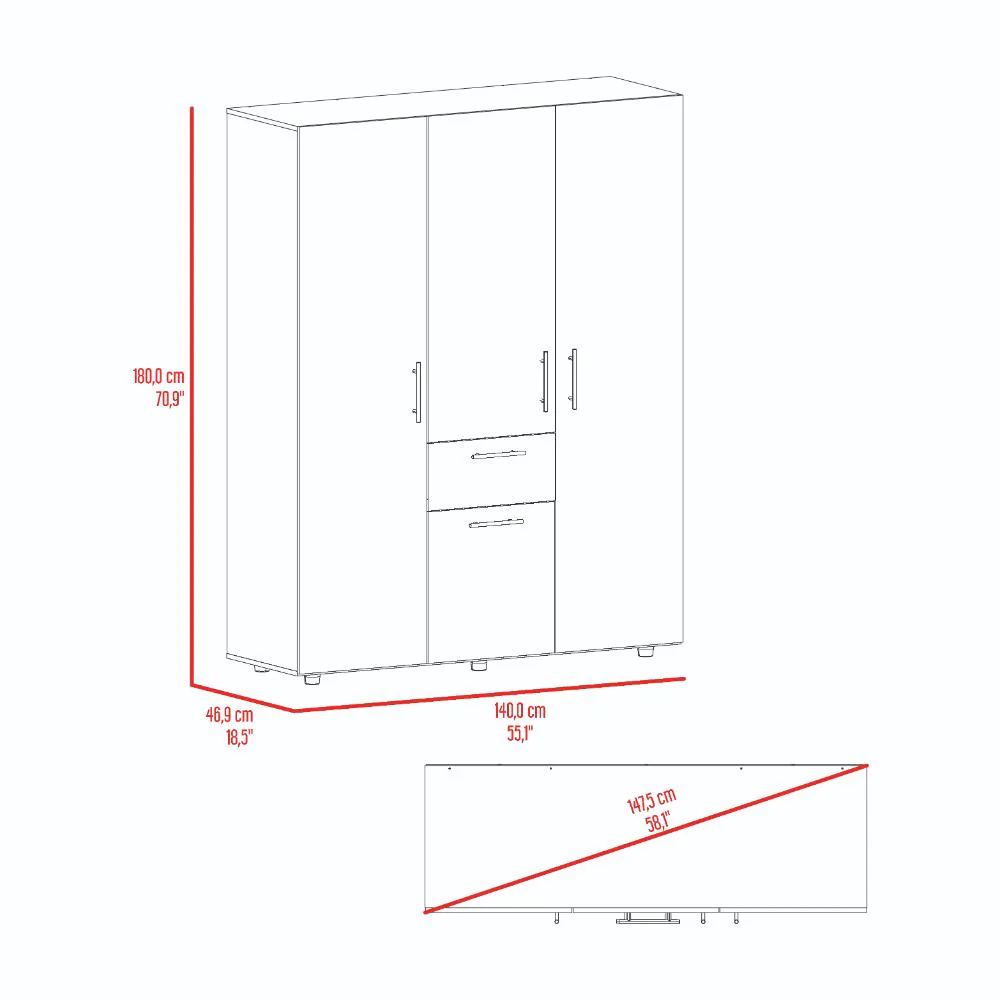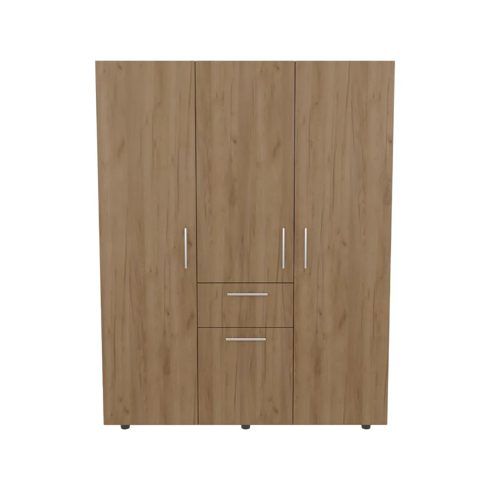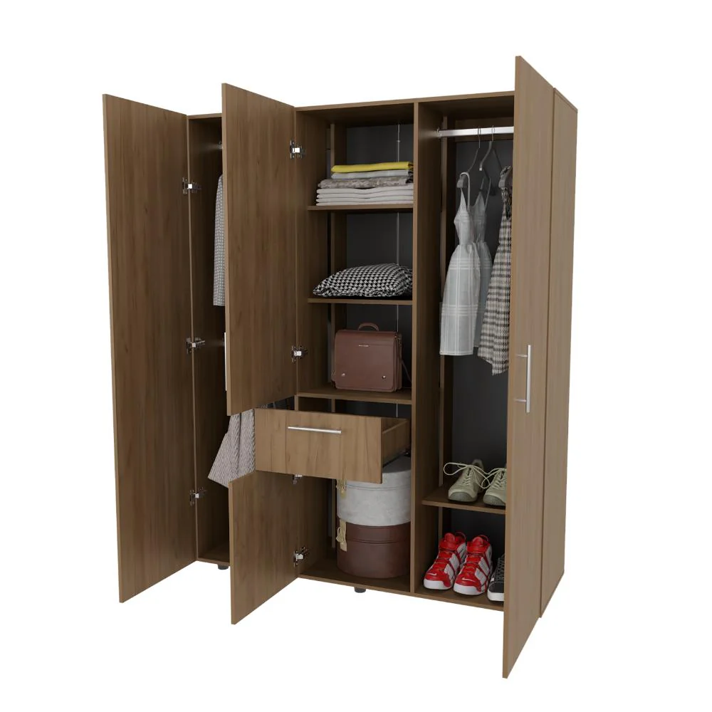 Closet, con 4 puertas abatibles, tres tubos olvalados para colgar ropa, manijas metalicas 1 cajon organizador, amplios espacios para guardar ropa.
