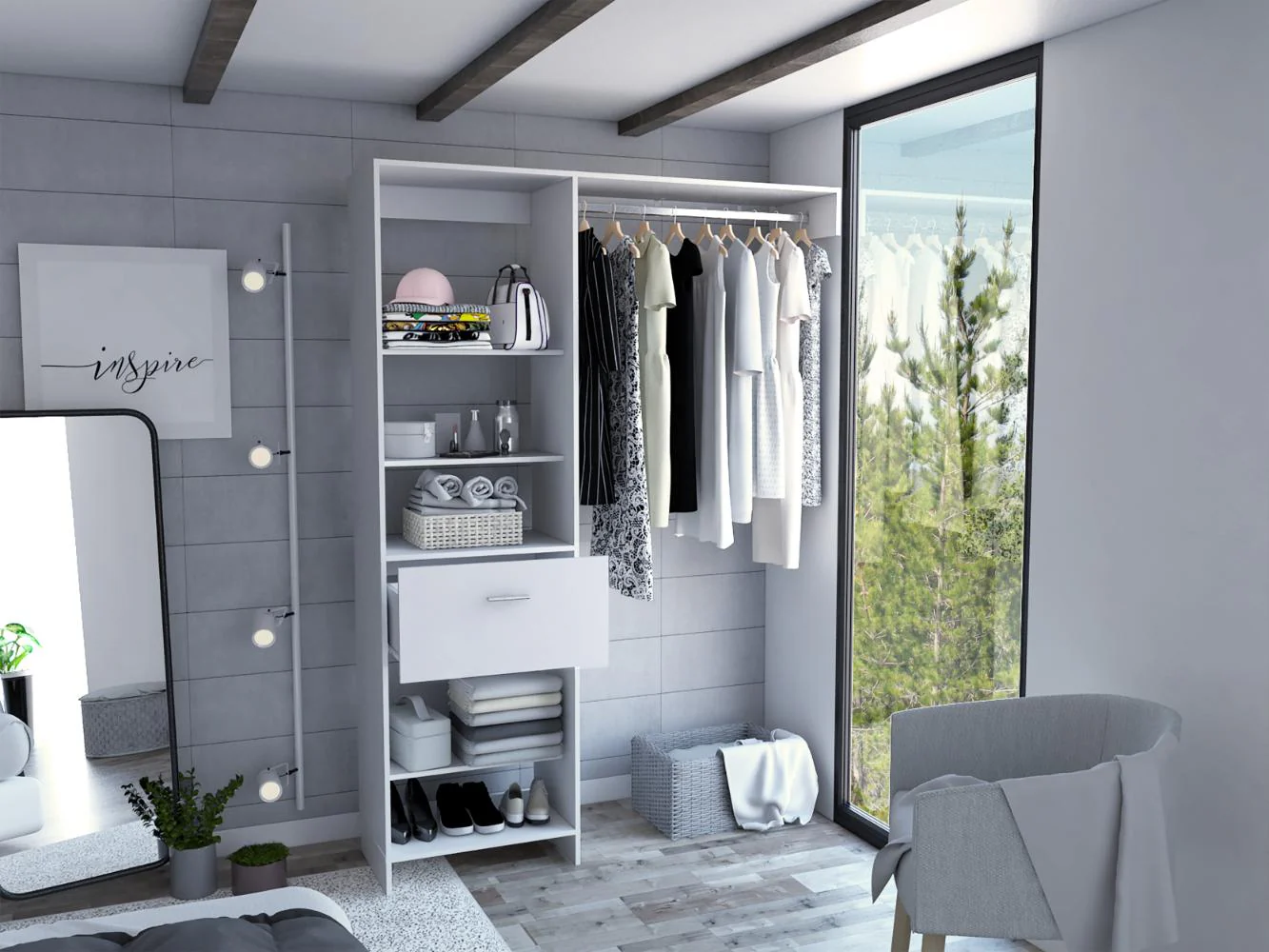 Closet, con amplio espacio de almacenamiento, cuenta con 1 cajón, tres entrepaños y un tubo para colgar ropa, el mueble se debe anclar a la pared e incluye los elementos necesarios.