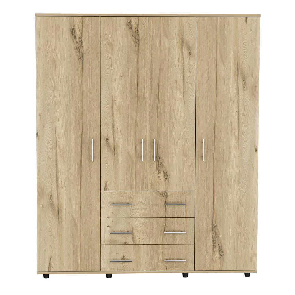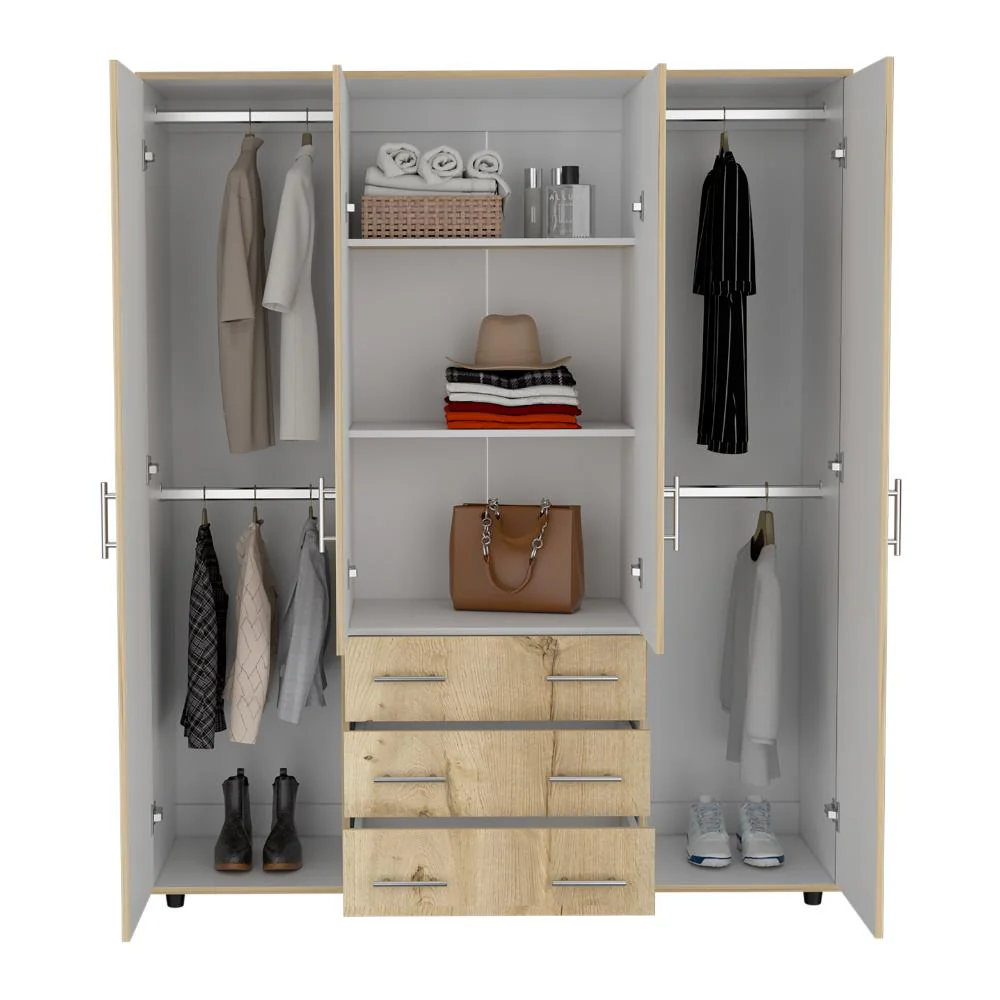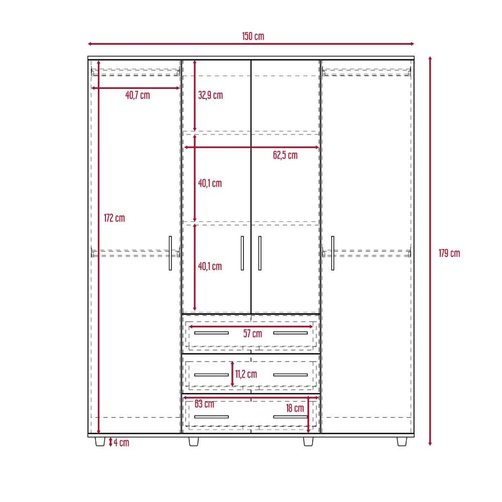 Closet, con diseño funcional; 4 puertas abatibles, 3 cajones organizadores; amplios espacios para guardar ropa, accesorios y zapatos; y 4 tubos cromados para colgar ropa.