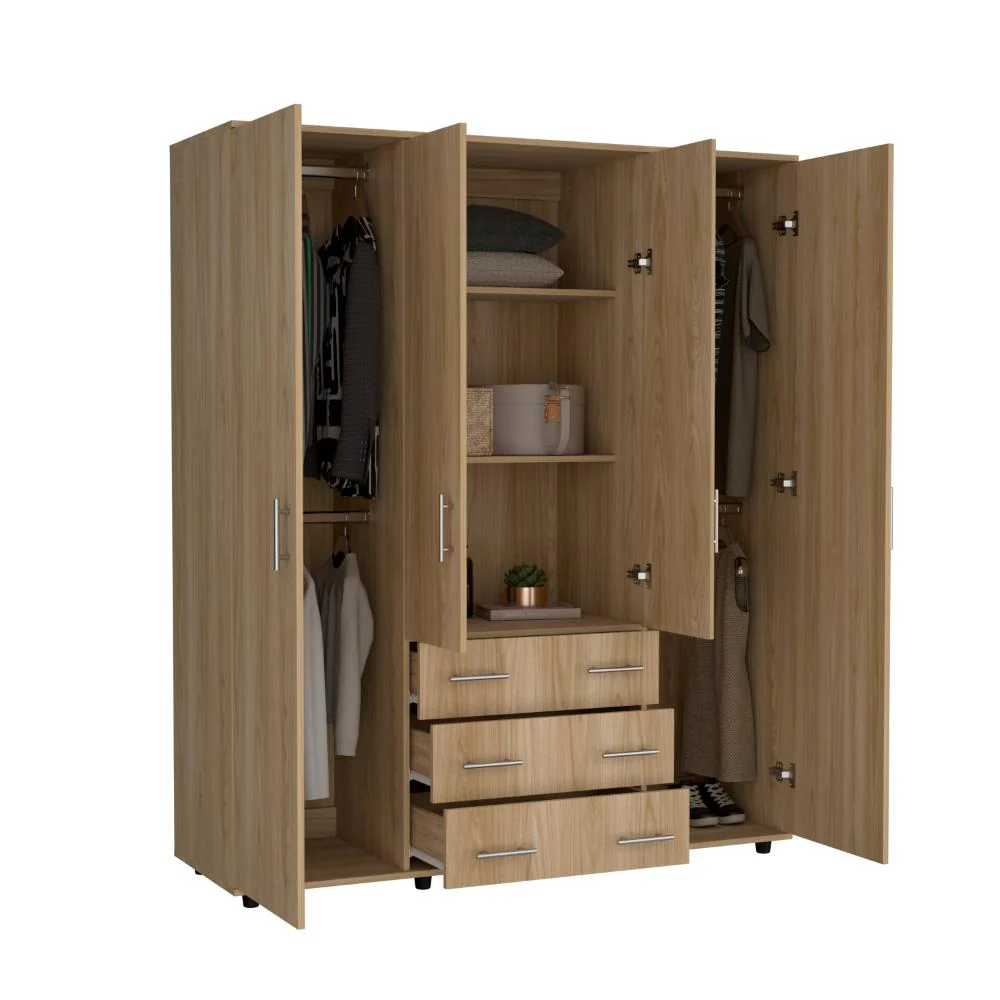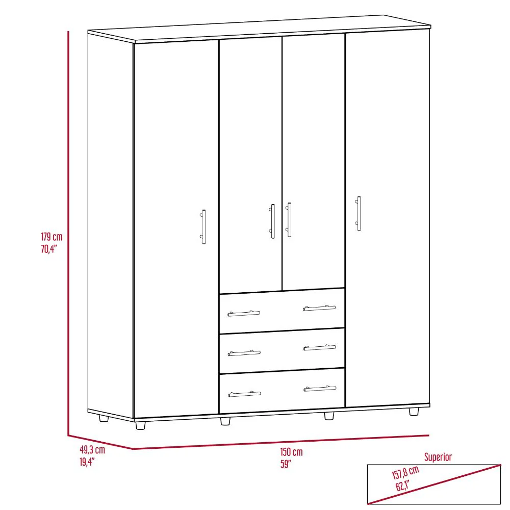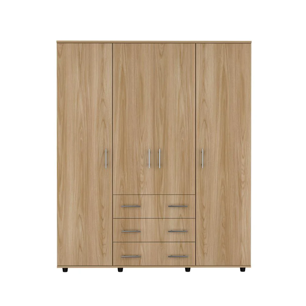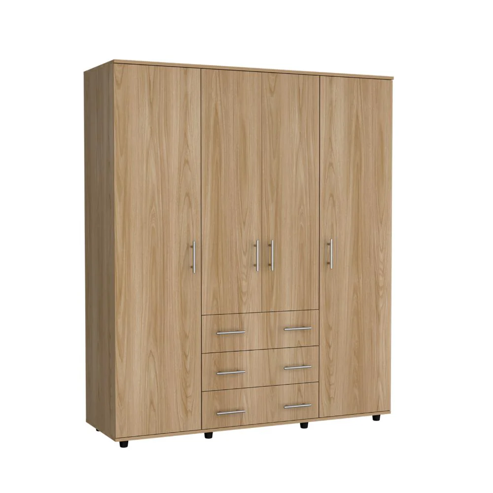 Closet, con diseño funcional; 4 puertas abatibles, 3 cajones organizadores; amplios espacios para guardar ropa, accesorios y zapatos; y 4 tubos cromados para colgar ropa.
