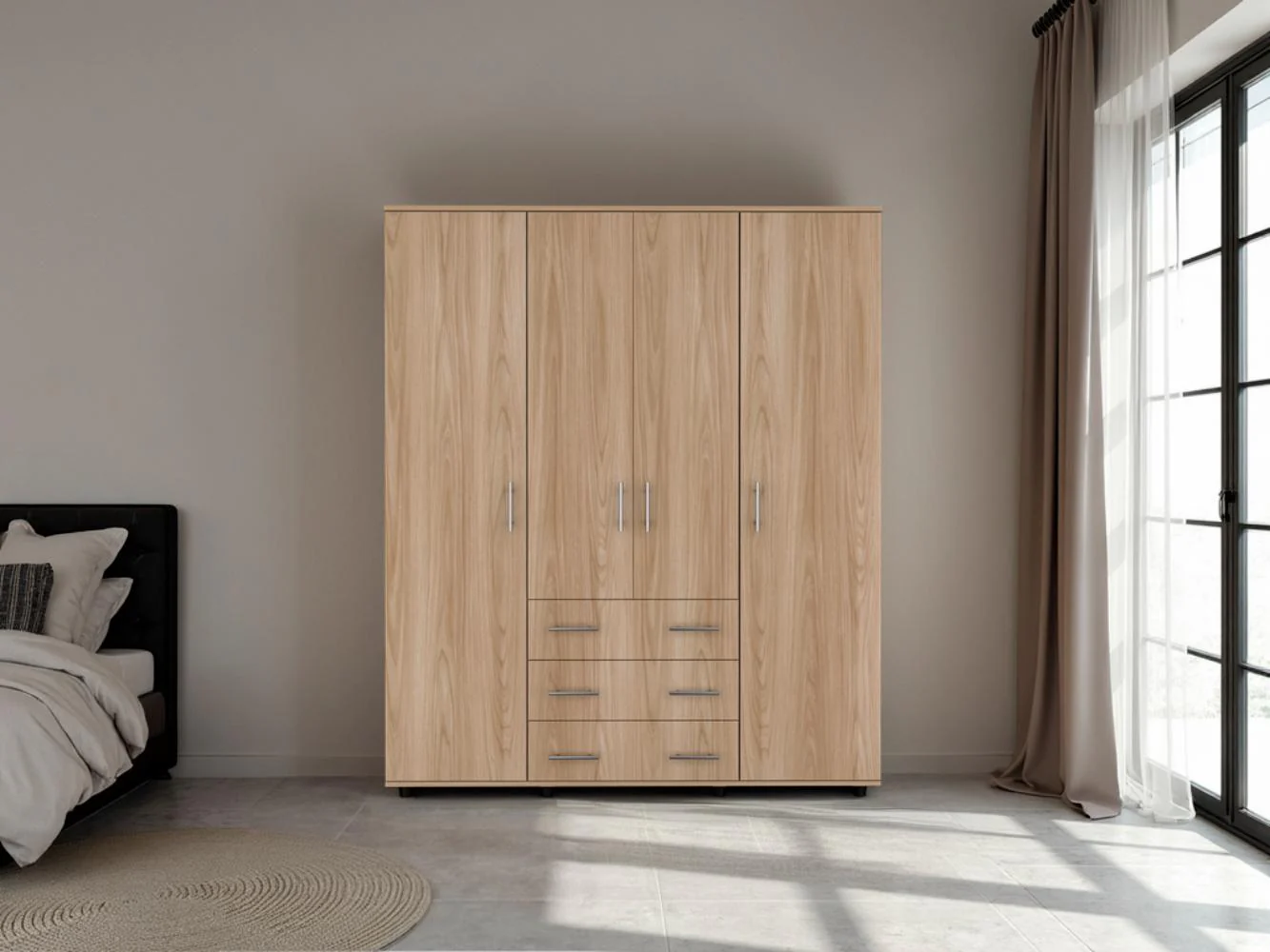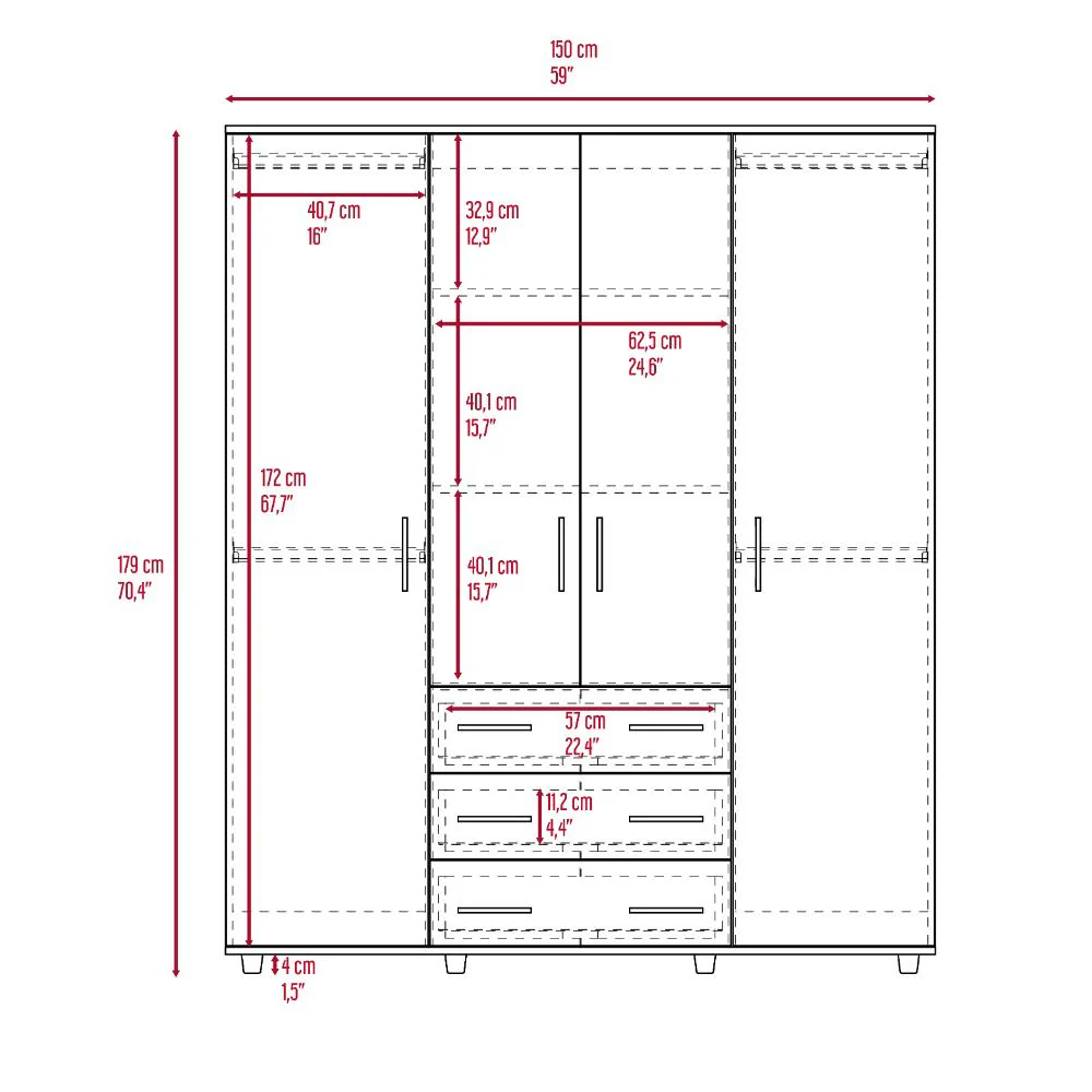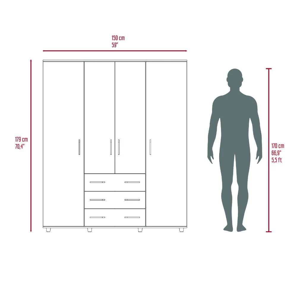 Closet, con diseño funcional; 4 puertas abatibles, 3 cajones organizadores; amplios espacios para guardar ropa, accesorios y zapatos; y 4 tubos cromados para colgar ropa.