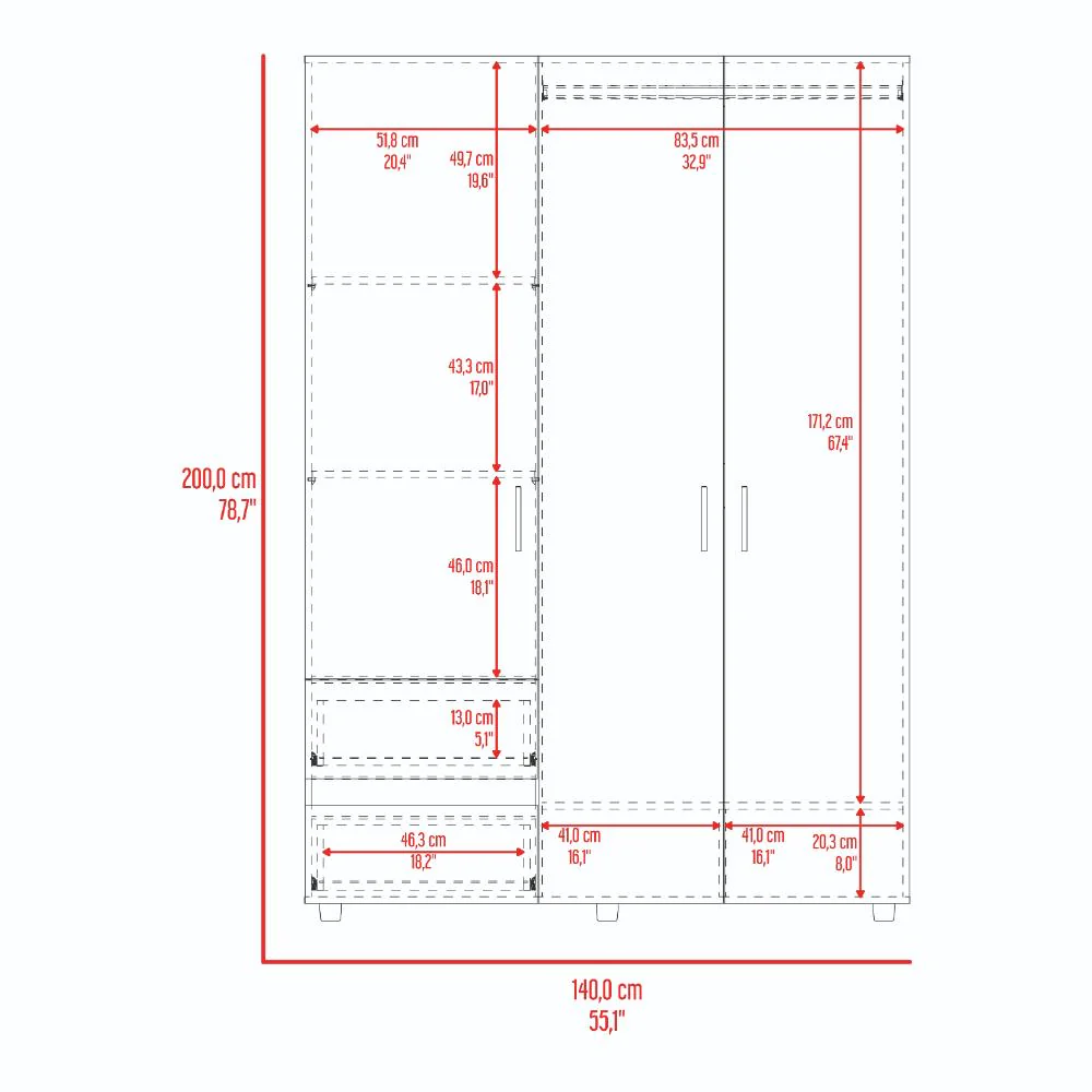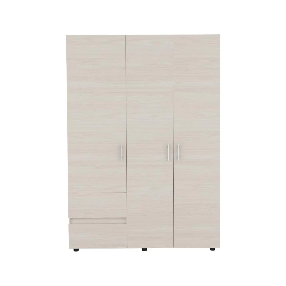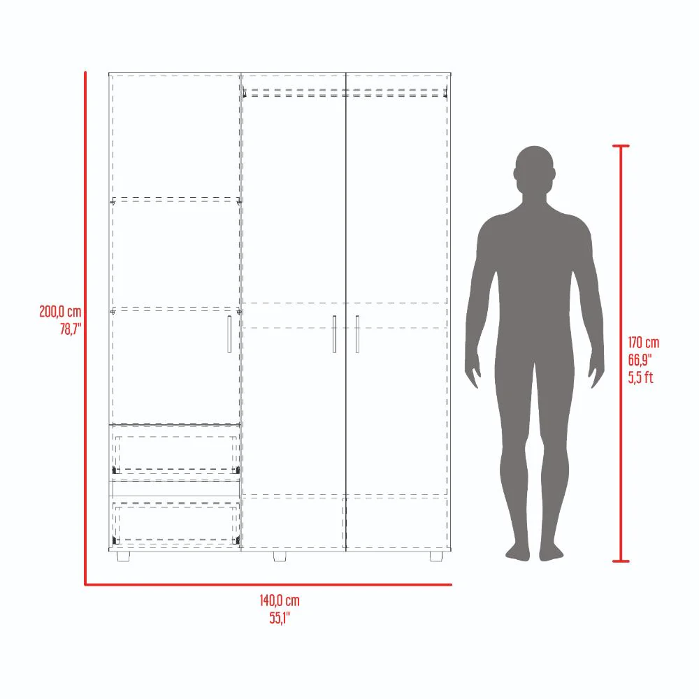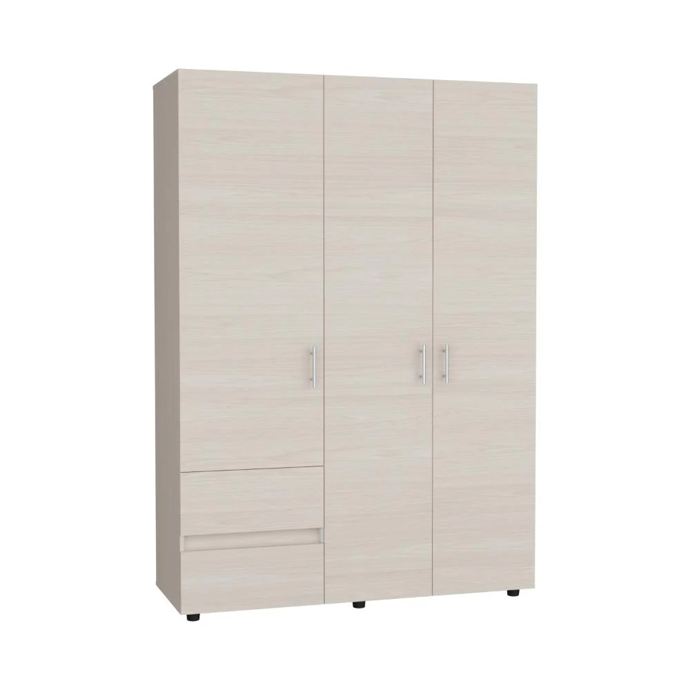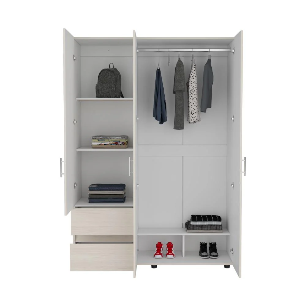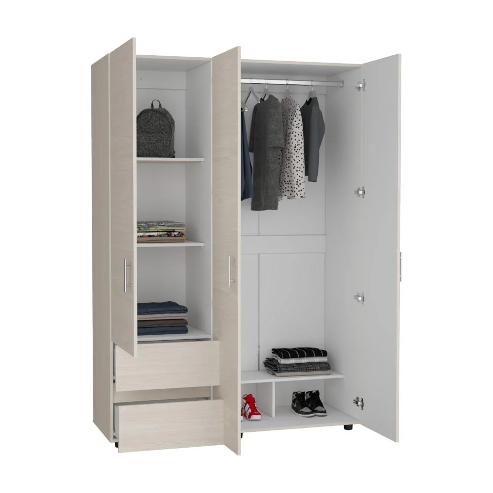 Closet, con colgador para ropa, tres puestas abatibles, entrepaños para poner ropa, dos cajones.