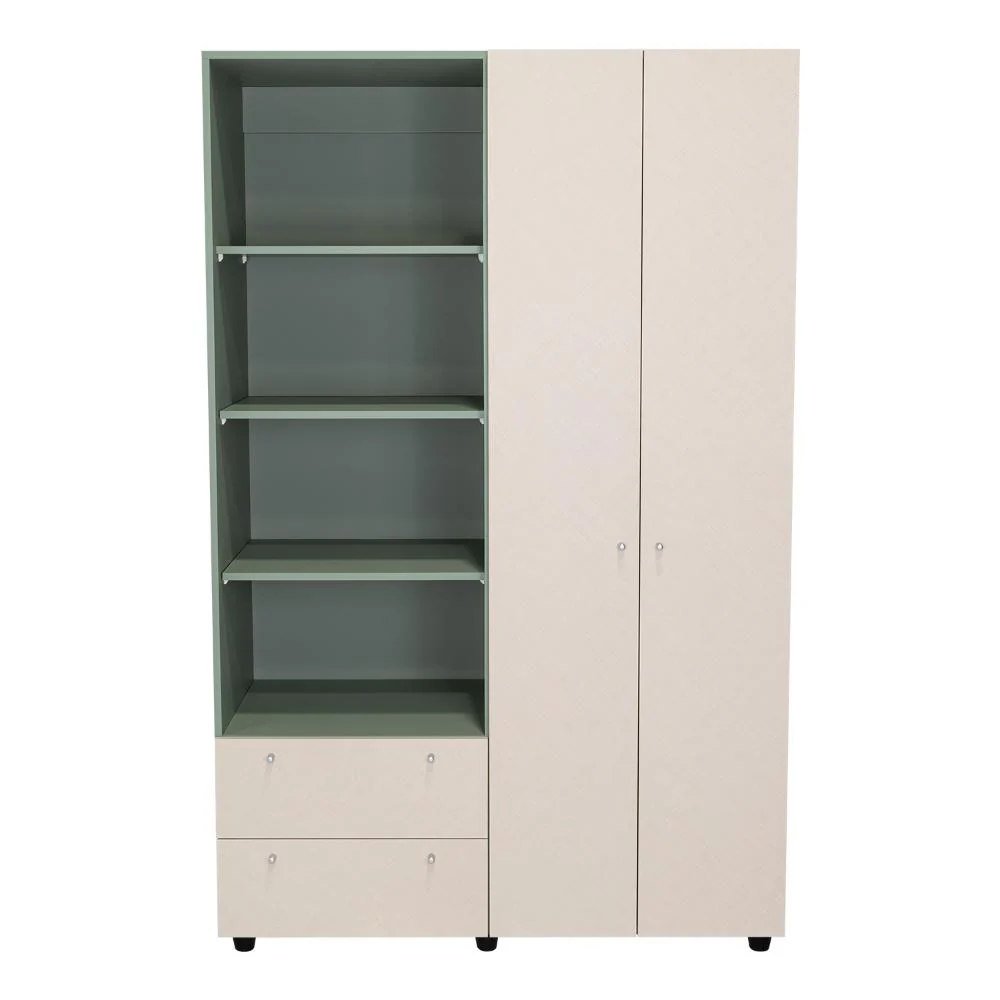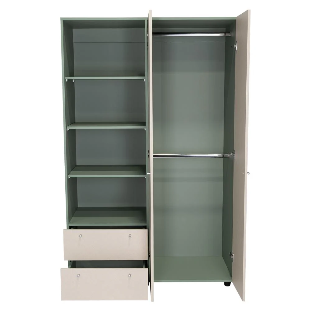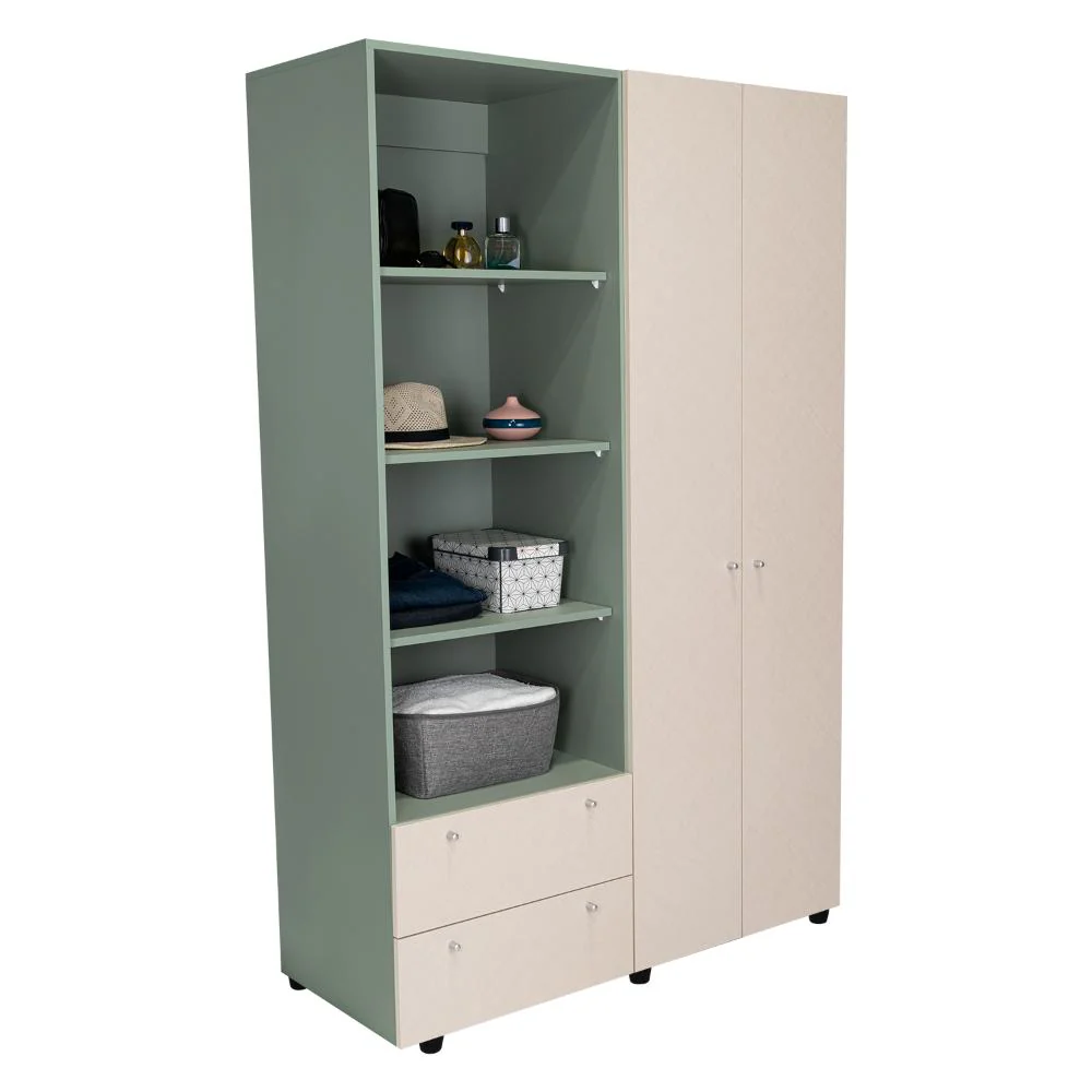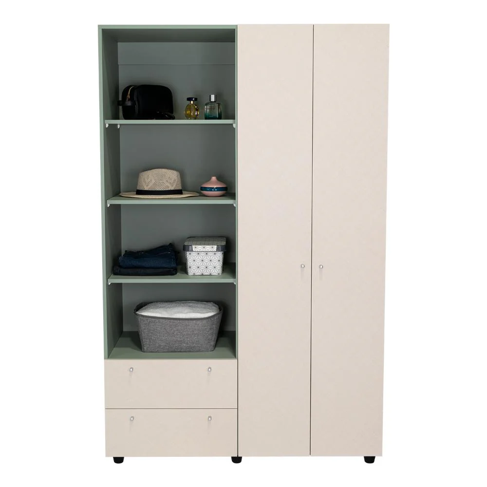 Closet, con dos cajones y dos puertas abatibles, tubos para colgar ropa, botones y deslizadores plásticos.