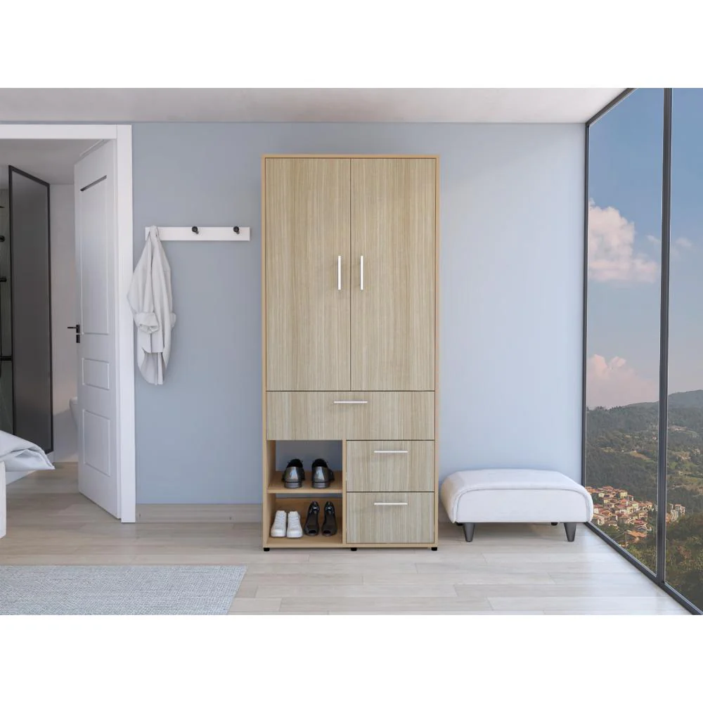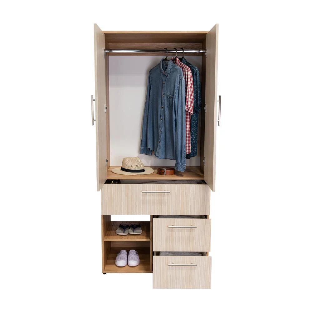 Closet, con amplio espacio interno para guardar ropa e implementos personales, dos puertas abatibles y tres cajones, diseño moderno.