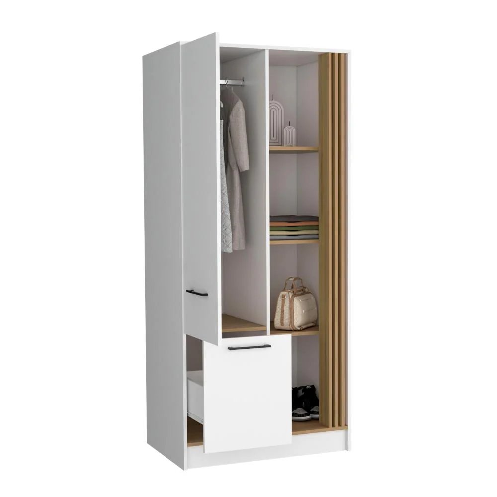 Closet, con diseño moderno, una puerta abatible y un cajón, amplios entrepaños visibles