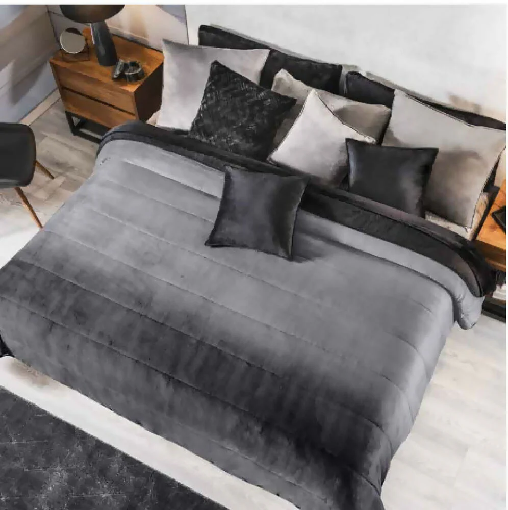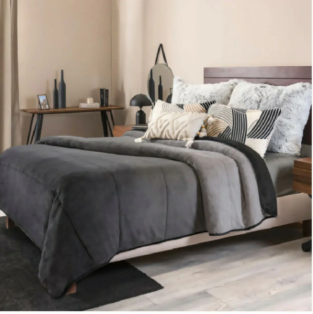 Cobertor Invernal Groenlandia, para cama Sencilla y Doble. Elaborado en tela extrasuave y máxima calidez. De Doble Faz, por un lado en degradé de grises a negro, y por el otro en tela borrega de pelo corto extrasuave en color negro. El aliado perfecto para que tus noches sean cálidas y muy confortables, además brinda un toque sobrio a tu habitación.