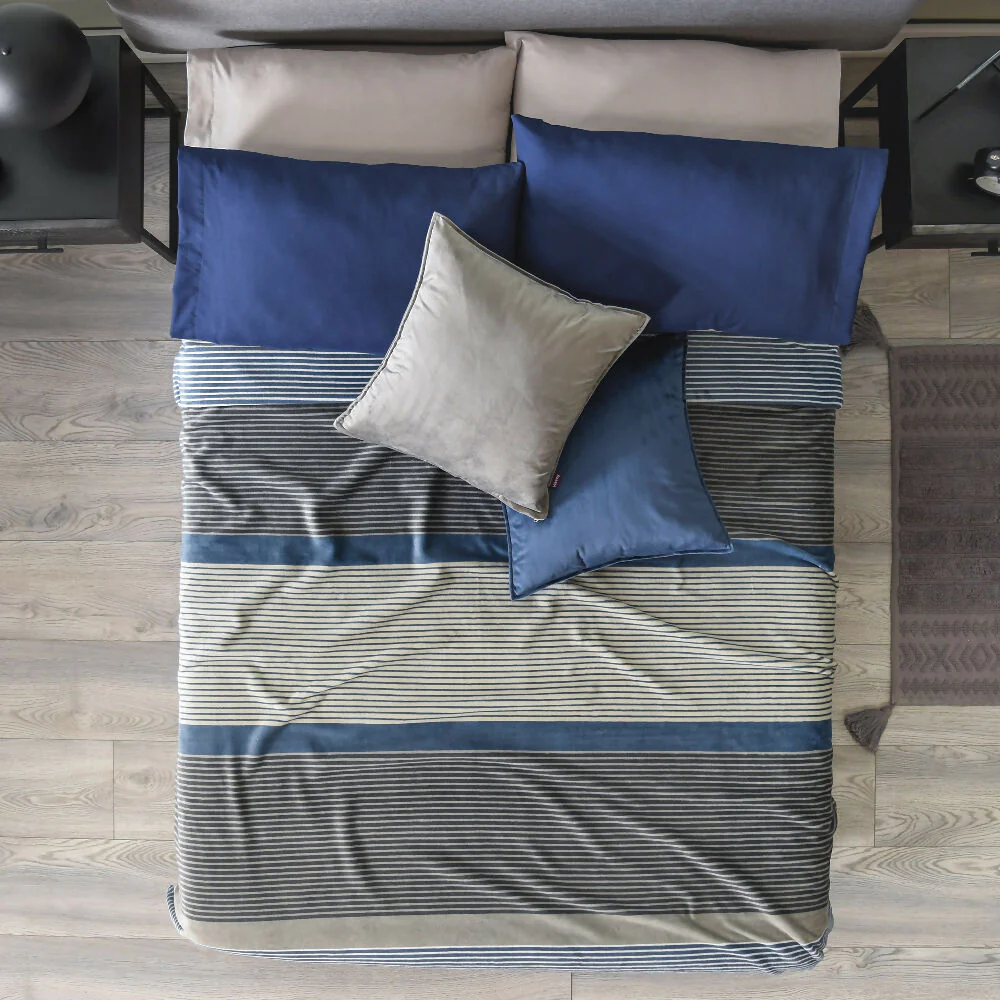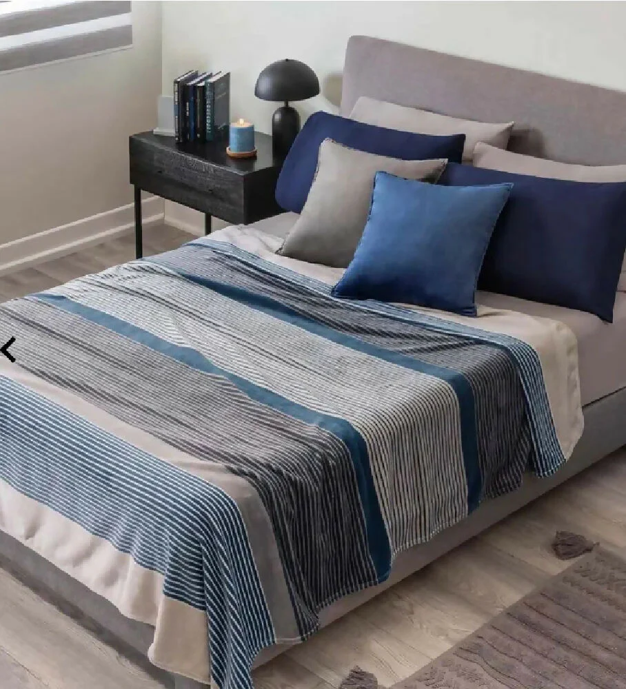 Cobertor ligero Michigan, para cama Queen y King. Elaborado en tela extrasuave y cálida. Esta delicada prenda, otorga un toque serio a tu habitación, y se convierte en la mejor aliada para acompañar tus noches y sentirte más confortable en tu cama. Estampado de líneas azules y grises.