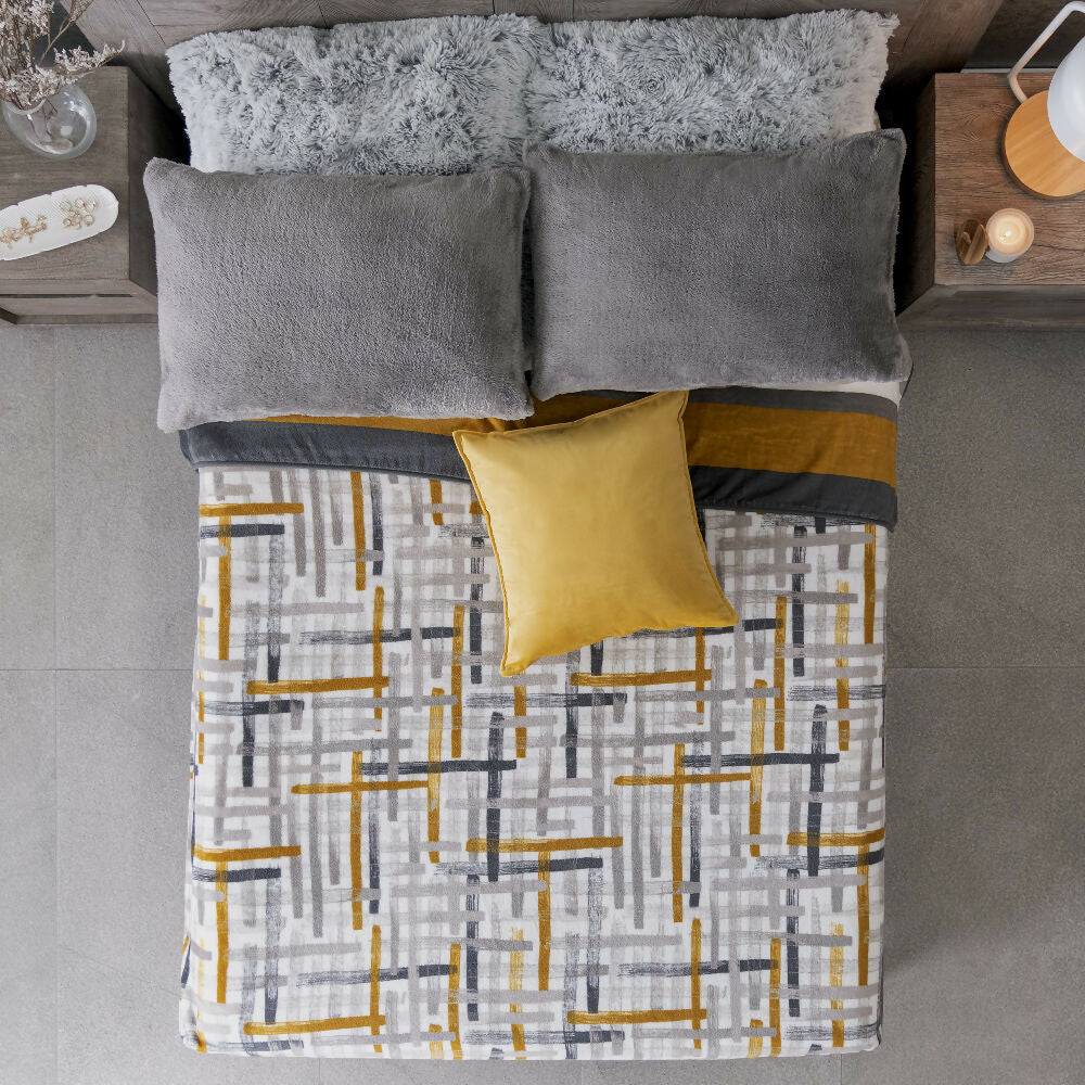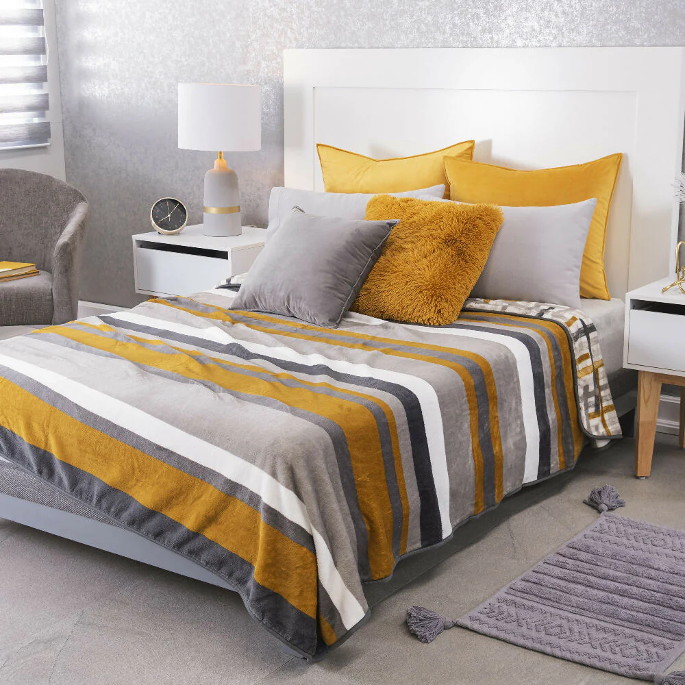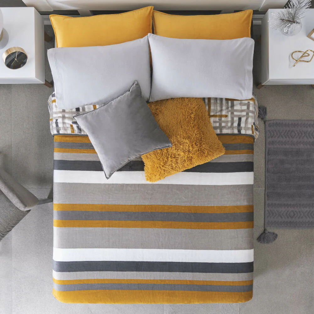 Cobertor Nórdico Praga, para cama Queen y King. Elaborado en tela extrasuave y máxima calidez. De Doble Faz, en tonos amarillos y mostaza, que dan un tono vibrante a tu habitación. El aliado perfecto para que tus noches sean cálidas y muy confortables.