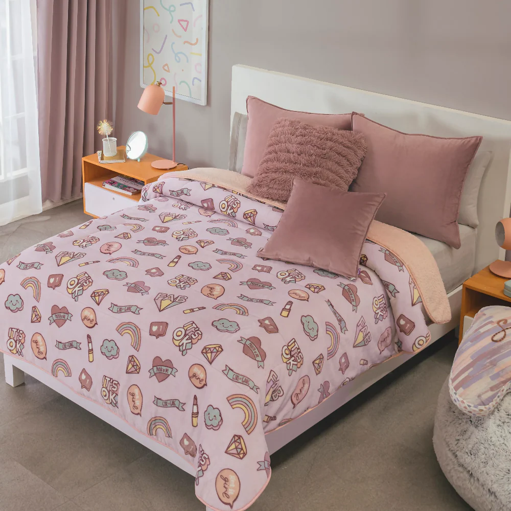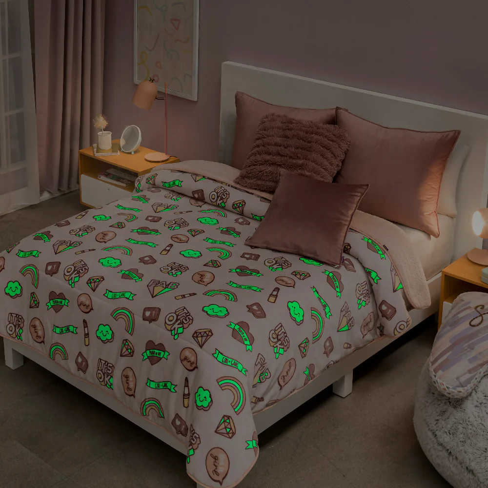 Cobija Invernal Fun para cama Sencilla y Doble, con primera vista de textura suave Beauty Soft que brilla en la oscuridad y su segunda vista de borrega premium. Dale a tu habitación esa personalidad fabulosa y divertida, ya que por su increíble paleta de color de lilas cálidos y toques en menta hará de tu espacio un lugar lleno de alegría.
