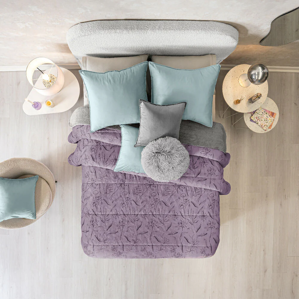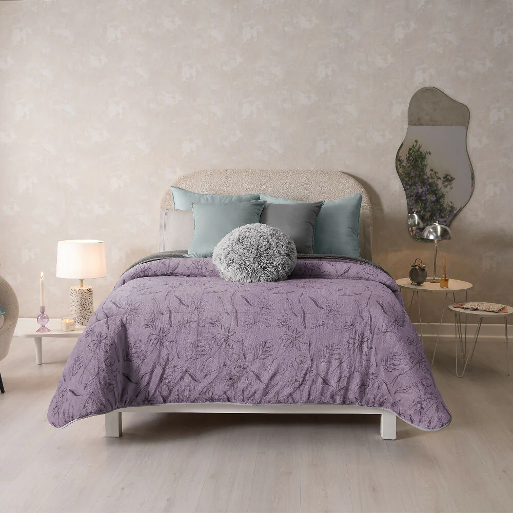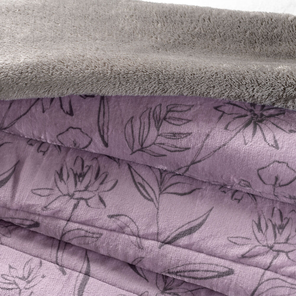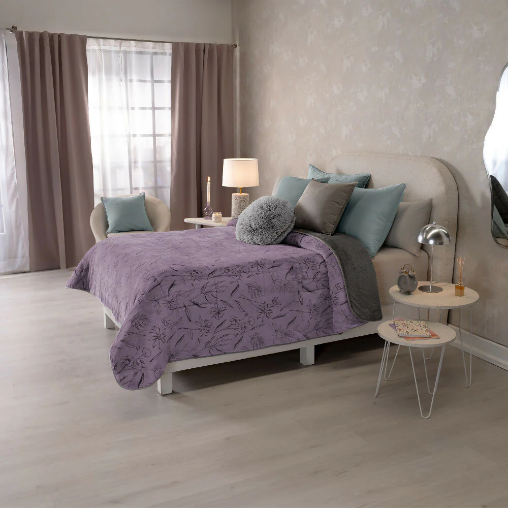 Cobija Invernal Lavanda, doble faz, para cama Sencilla y Doble. De textura suave Beauty Soft y su segunda vista de borrega premium. Te brinda máxima calidez y suavidad. Su encantador tono lila complementado con un delicado motivo de flores en contorno lo hace ideal para cualquier edad.