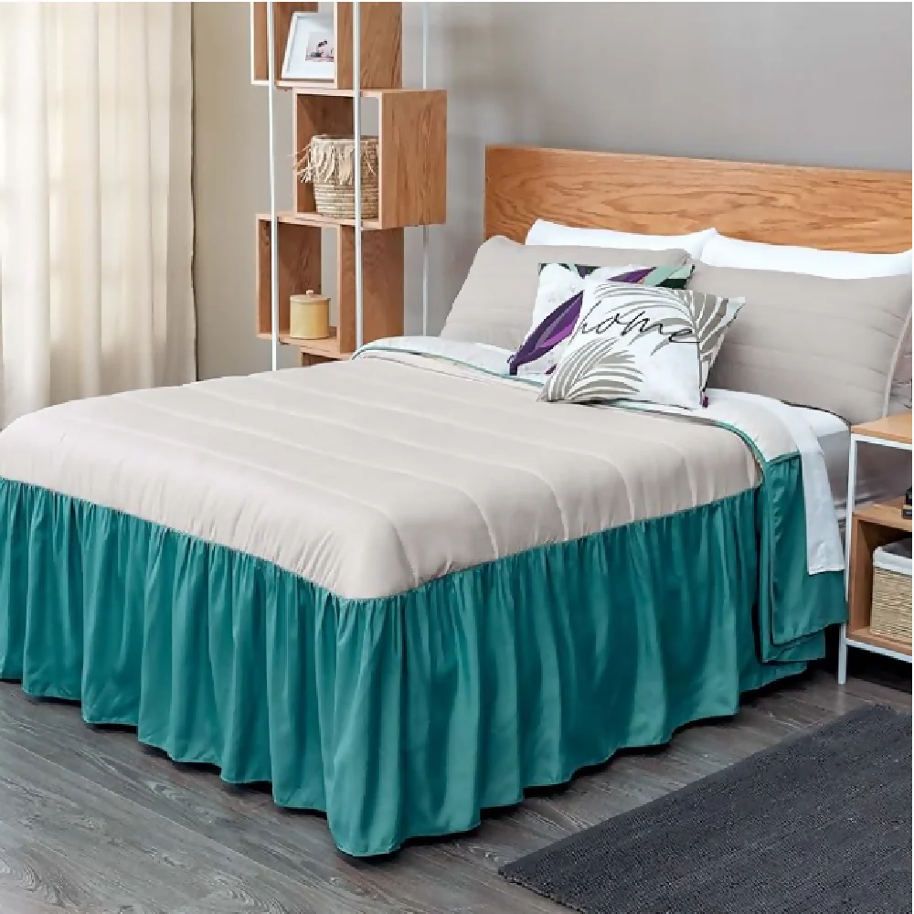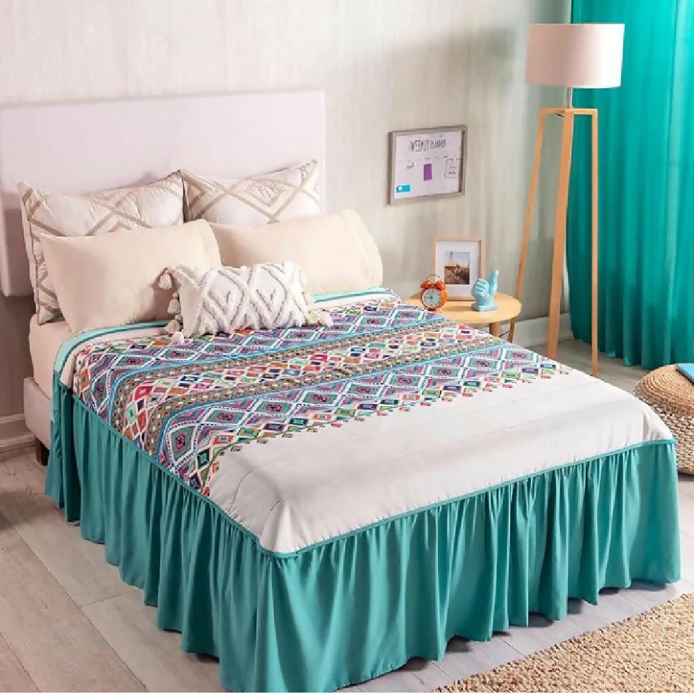 Colcha para cama Doble con faldón o volado étnico, estampado y suave por su tela viasoft. Disfruta su doble faz, y juega con sus colores alegres y sutiles. Crea una atmósfera cálida y llena tus espacios de armonía y versatilidad.