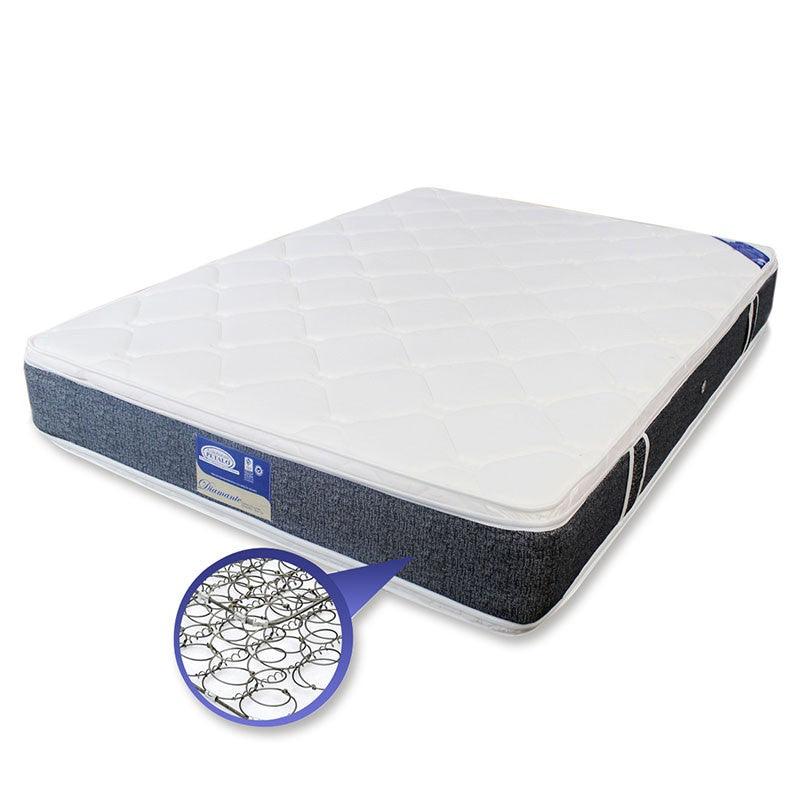 Unidad recurrida: Fabricada con resorte en espiral (7 vueltas) de calibre 13 boca de 8.0 en acero 1070 de alto carbono. Los resortes están unidos entre sí por alambre espiral con alto contenido de carbono ofreciendo mayor resistencia para que el cuerpo se apoye anatómicamente. Marco en varilla de acero calibre 7, y laterales calibre 9 que permiten mayor dureza y estabilidad sin que por exceso de uso pueda disminuir la vida útil de la estructura. Por su gran cantidad de recursos tiene excelente resistencia y dureza.