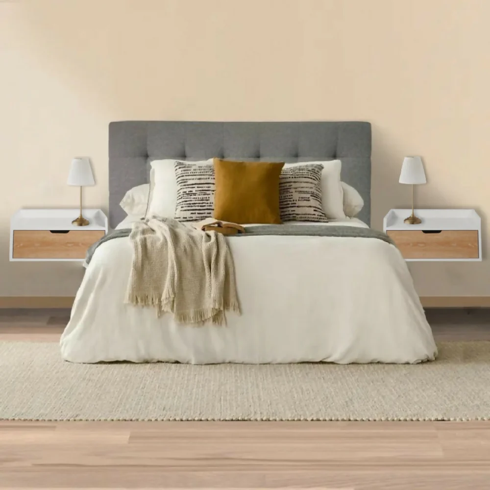 dkoCombo alcoba: Cabecero doble capitoneado + Set x 2 mesas de Noche. Tapizados en tela Memphis estructura en madera, espuma de alta densidad Set x 2 Mesas de Noche Toulus Flotante Blanca con puerta Vienes, en melamina de 15mm con protección antimicrobiana al 99,9%.