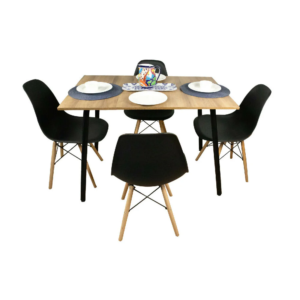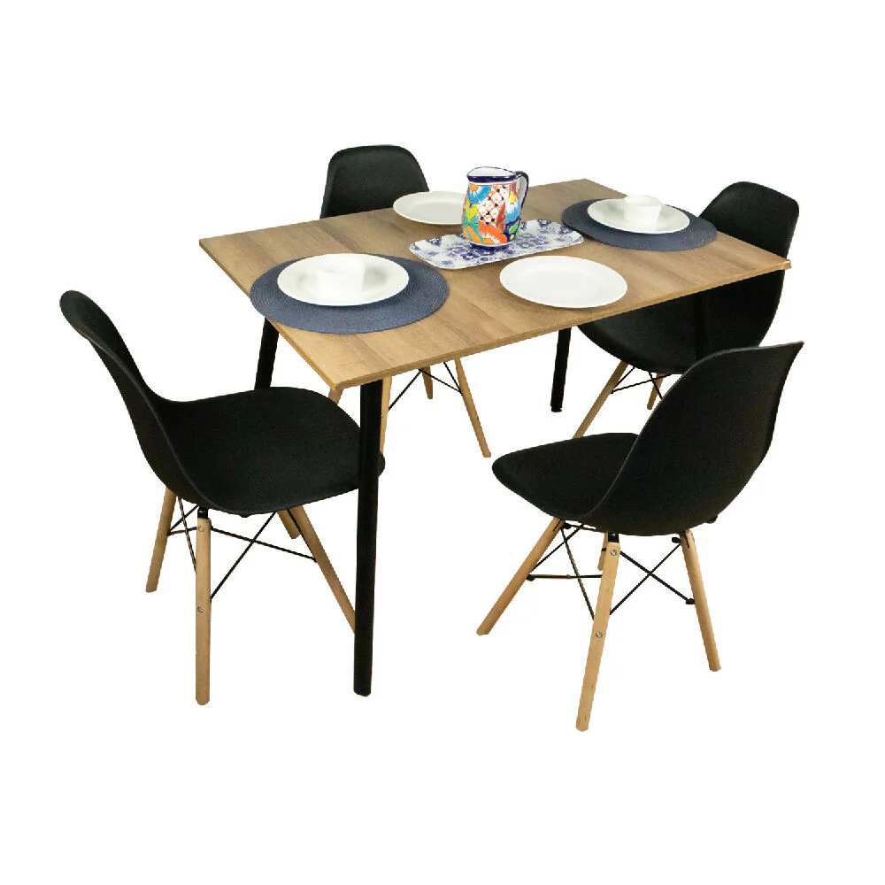 Combo Comedor Rectangular Amaretto fabricado en melamina de 15 mm con protección antimicrobiana al 99.9%, patas metálicas negras con pintura electroestática con niveladores. Set de 4 Sillas estructura asiento en polipropileno y patas de madera natural – Fácil ensamble.