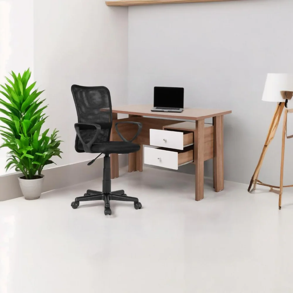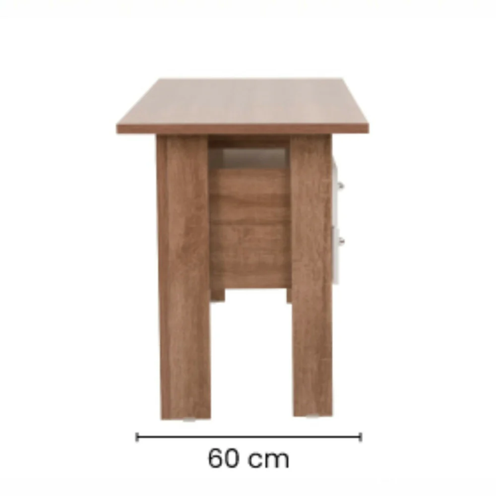 El escritorio Caburai, con acabado en madera natural y sus 2 cajones de puerta blanca, ofrece almacenamiento práctico, Fabricado en MDP para máxima durabilidad.