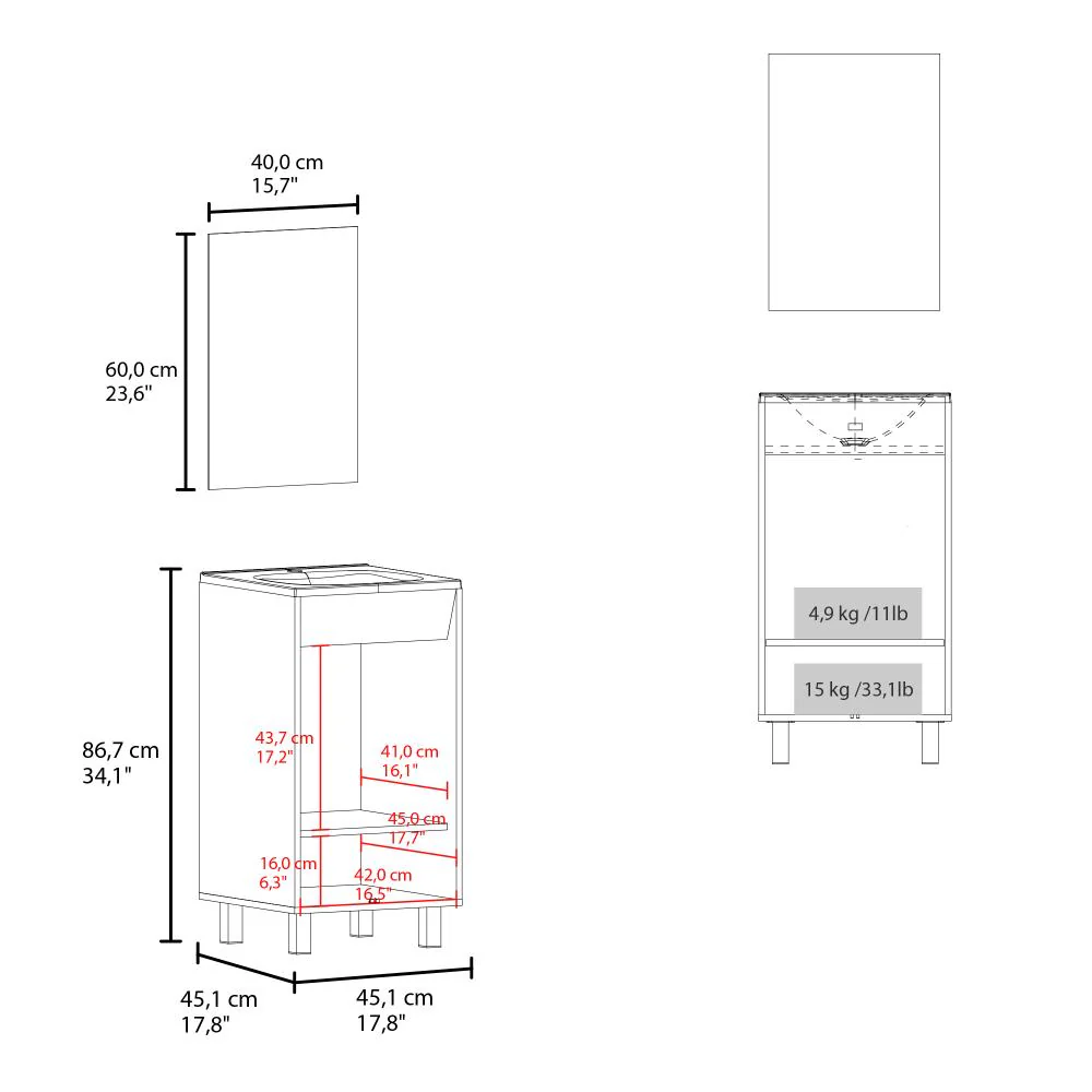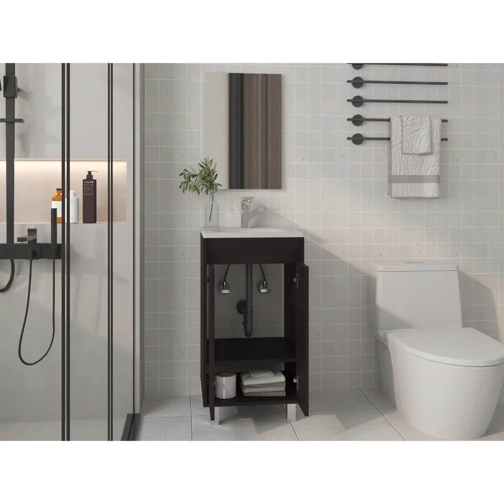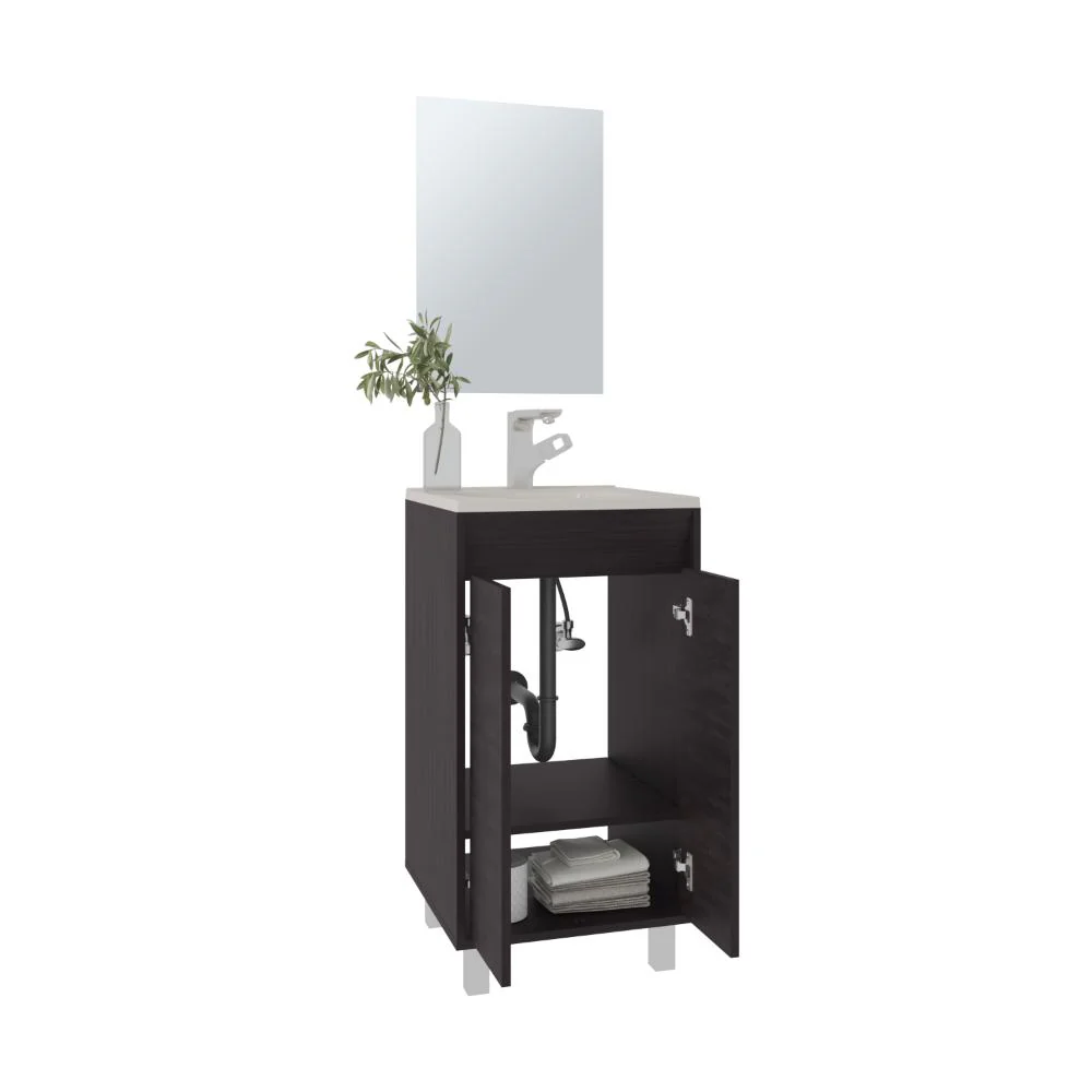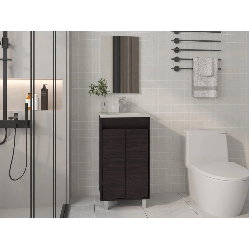 Mueble Lavamanos, cuenta con 2 puertas abatibles, 1 entrepaño y 4 patas metálicas + Espejo