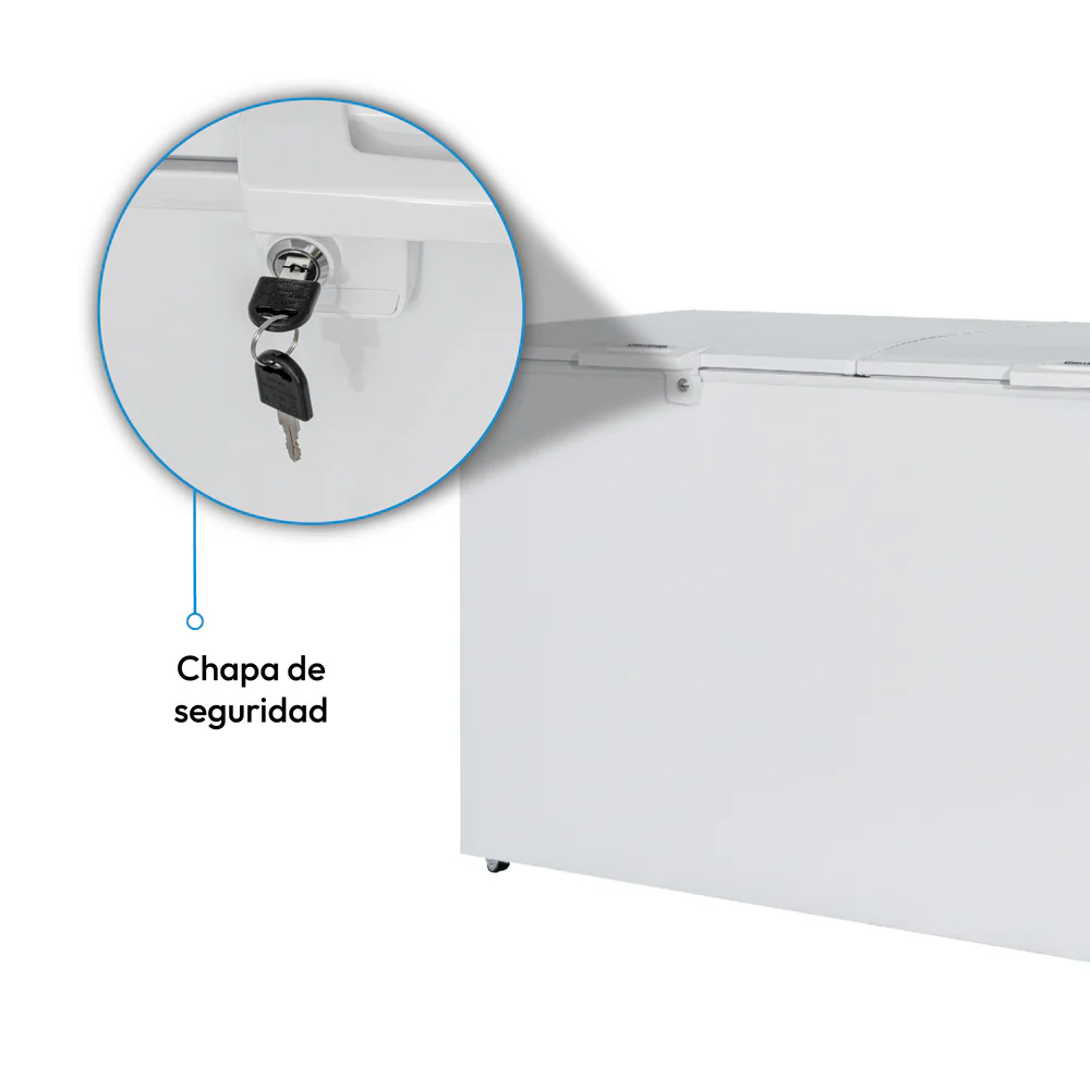 Este congelador cuenta con un rango de temperatura que va desde -18°C hasta 0°C, garantizando la preservación óptima de los alimentos. Su control de temperatura permite ajustar el frío según las necesidades específicas, asegurando que cada producto se mantenga en las condiciones ideales. Además, incluye una cerradura con llave, brindando mayor seguridad para el almacenamiento de productos valiosos.