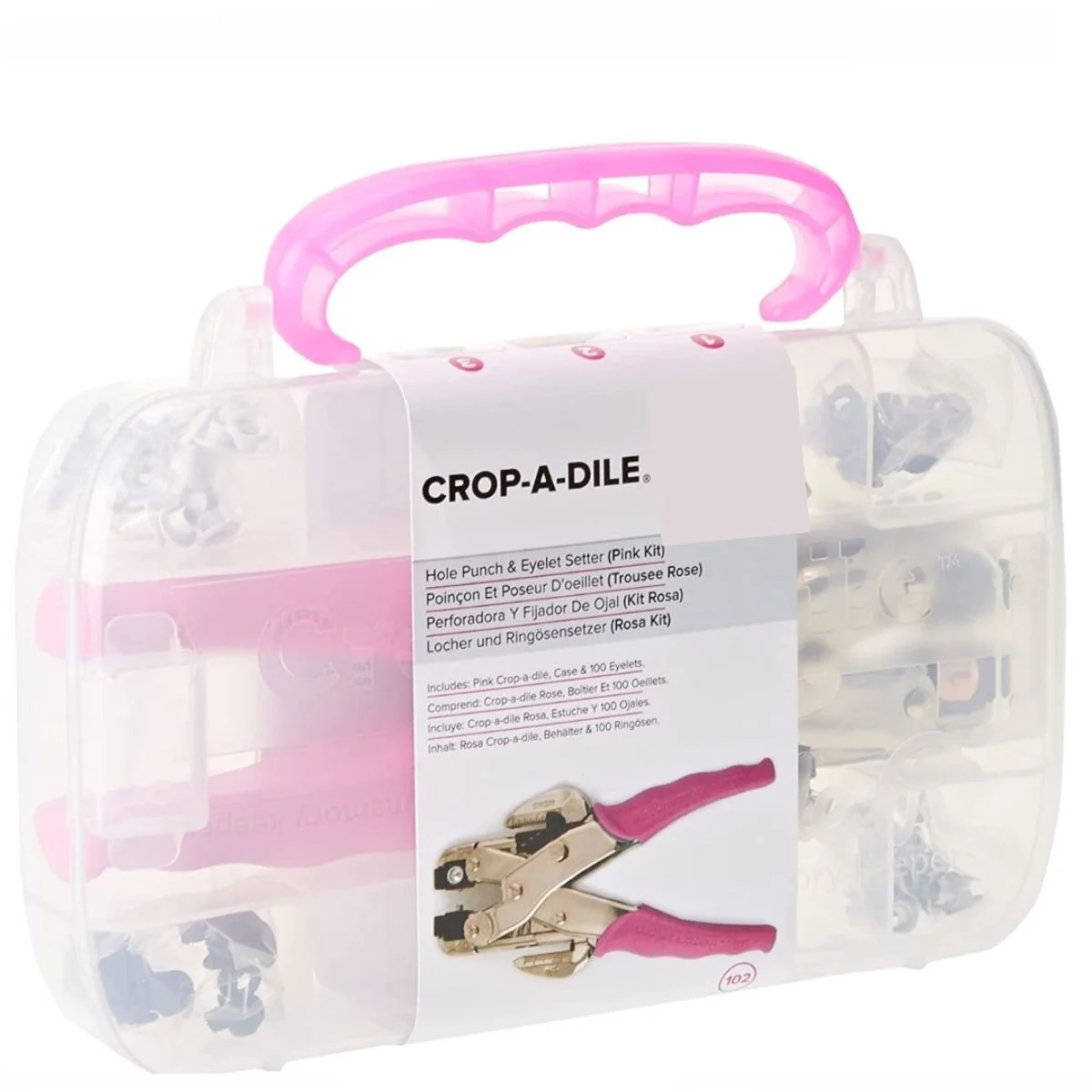La Crop- A- Dile es una especie de pinza con dos utilidades diferentes, por un lado perfora orificios en dos diferentes medidas (3/16″ Y 1/8″) y por el otro remacha eyelets, ojillos, gromlets, estoperoles, snaps…