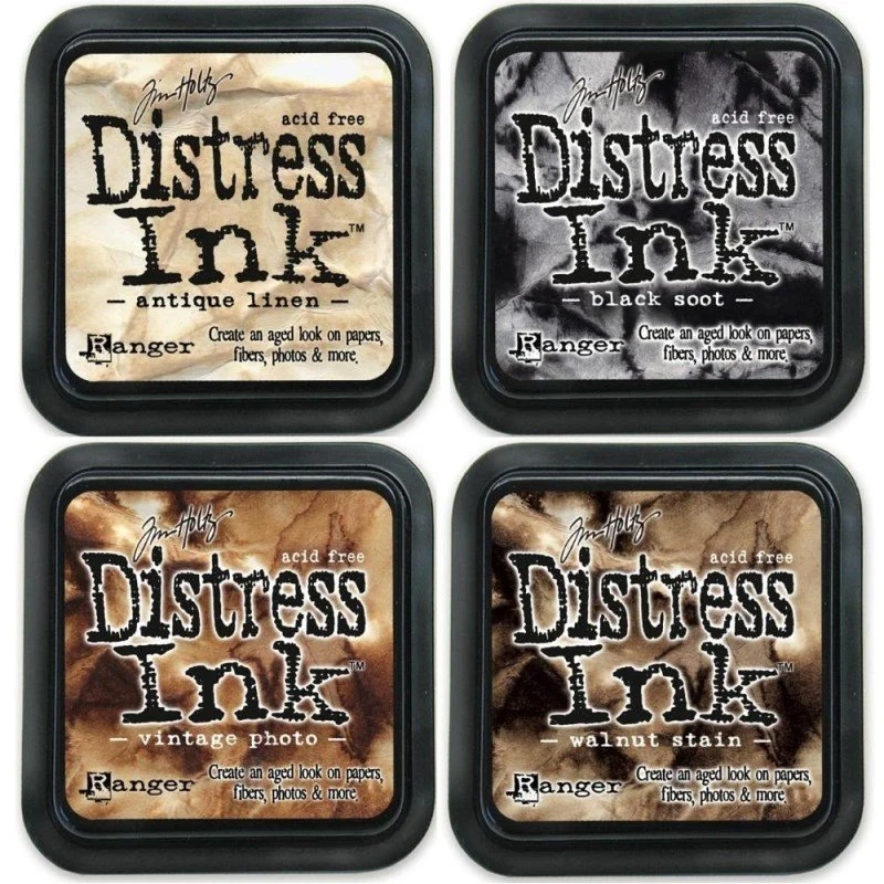 - 4 Tintas distress mini, colores Antique Linen, Vintage Photo, Walnut Stain, y Black Soot.