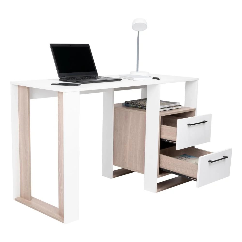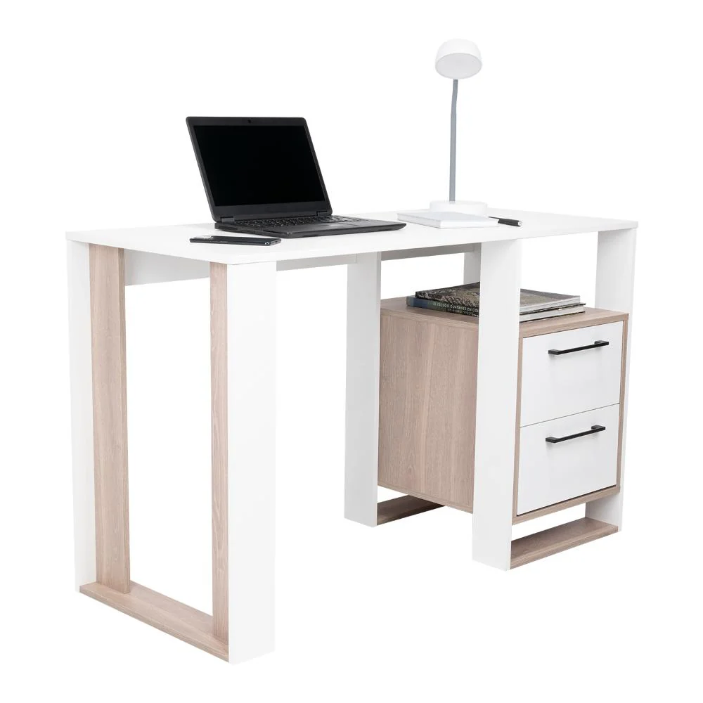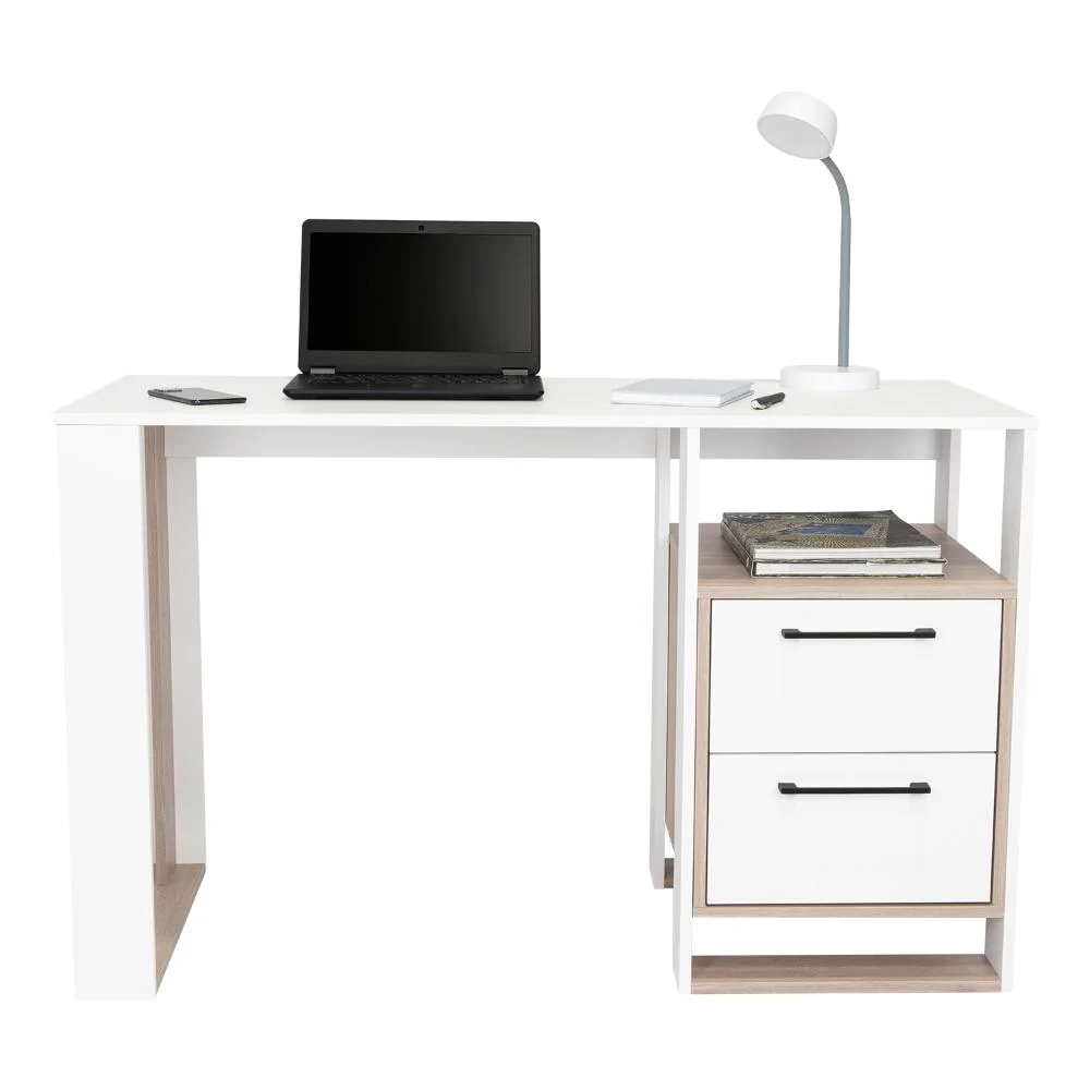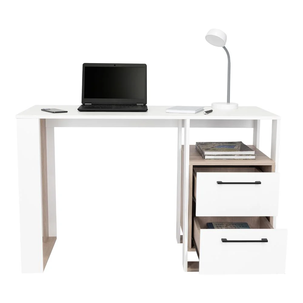 Escritorio, con amplia superficie de trabajo, dos cajones para ubicar objetos, diseño moderno.