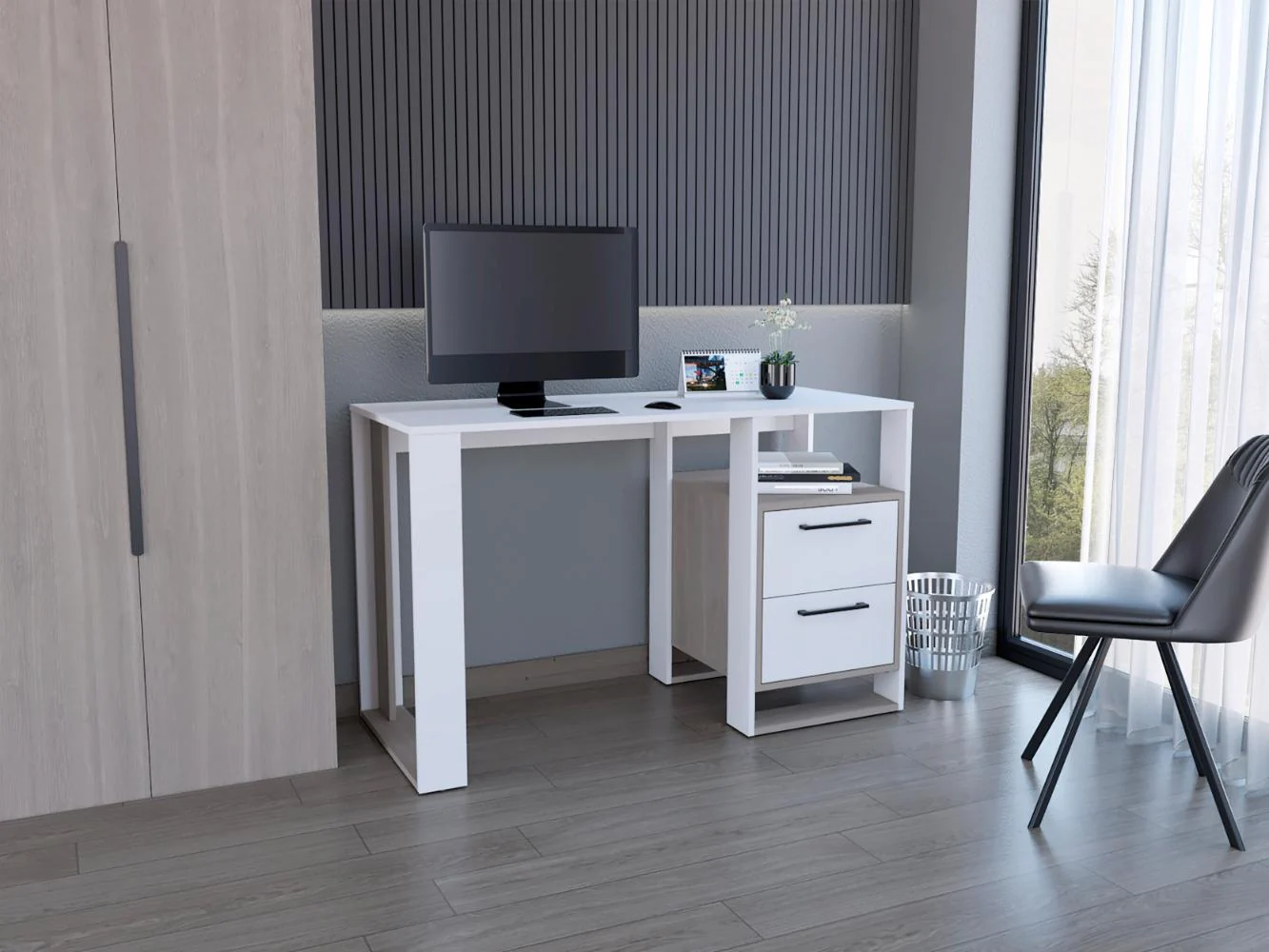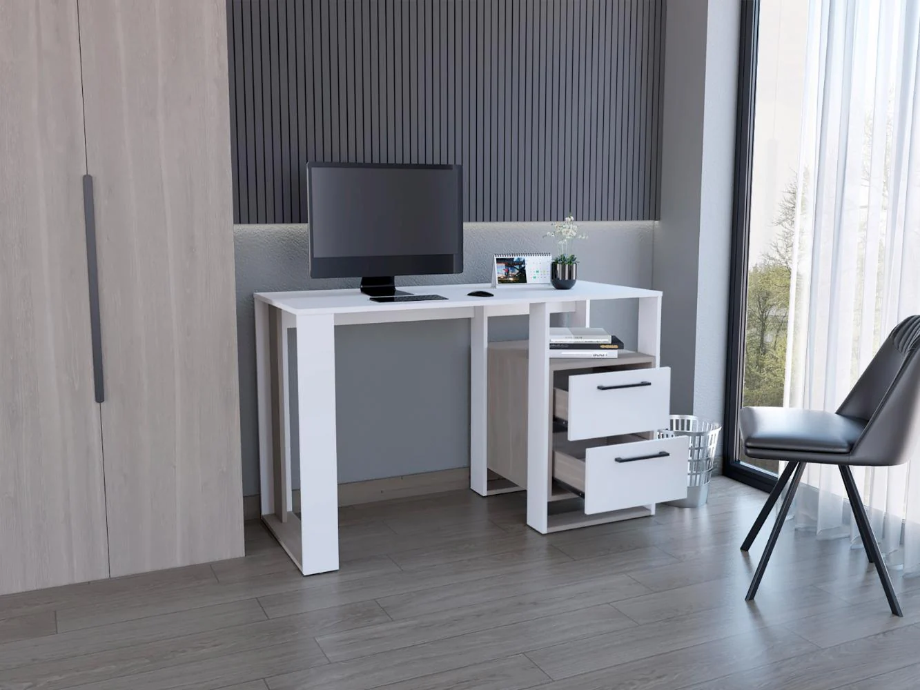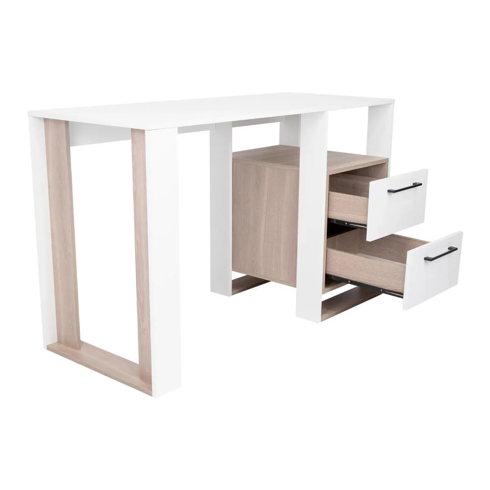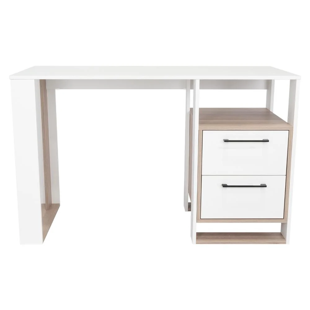 Escritorio, con amplia superficie de trabajo, dos cajones para ubicar objetos, diseño moderno.