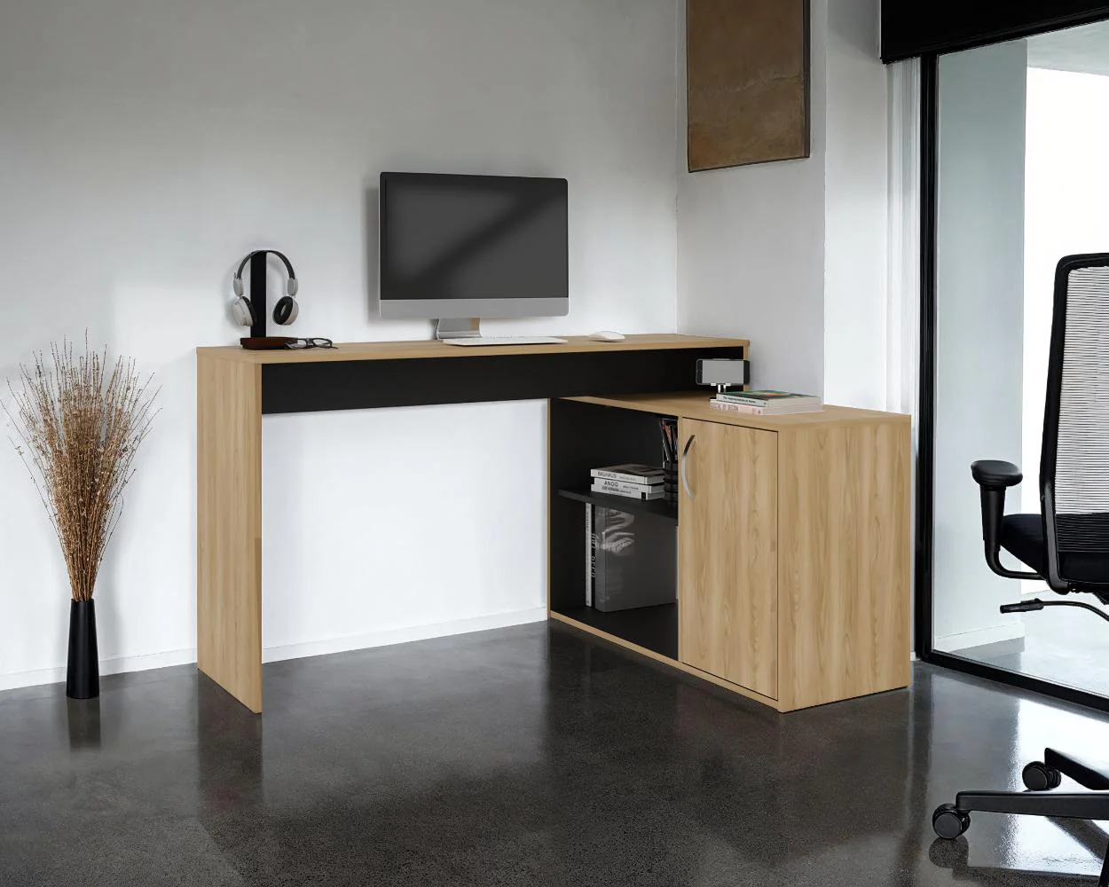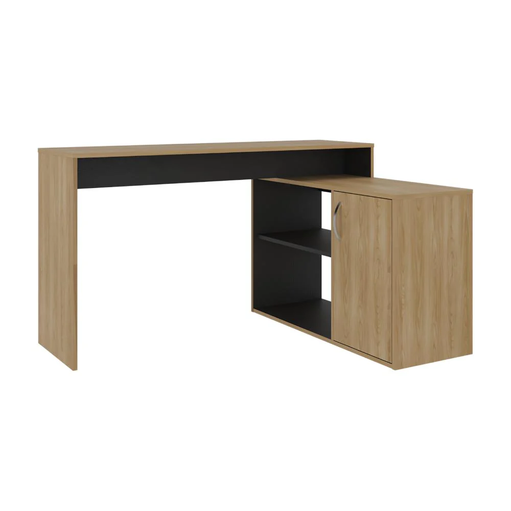 Escritorio con puerta batiente para almacenar libros y otros, compartimentos para objetos decorativos.
