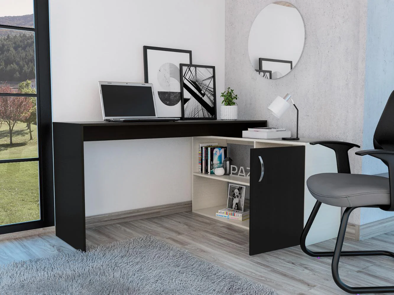 Escritorio en L, con espacio con puerta batiente para almacenar libro u otro, y